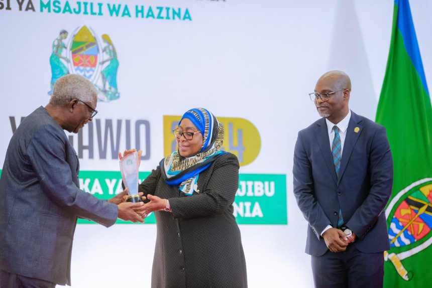 Rais wa Jamhuri ya Muungano wa Tanzania, Mhe. Dkt. Samia Suluhu Hassan, akimkabidhi tuzo Mwenyekiti wa Bodi ya EWURA, Prof. Mark Mwandosya baada ya EWURA kuibuka kinara kati ya taasisi za Serikali zilizotoa mchango mkubwa na kwa wakati kwa Serikali katika hafla iliyofanyika Ikulu, jijini Dar es Salaam tarehe 11 Juni 2024. Kulia ni Mkurugenzi Mkuu wa EWURA, Dkt James Mwainyekule akishuhudia upokeaji wa tuzo hiyo.