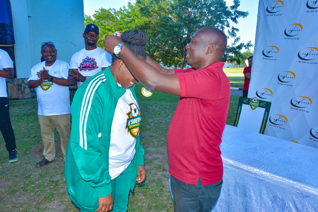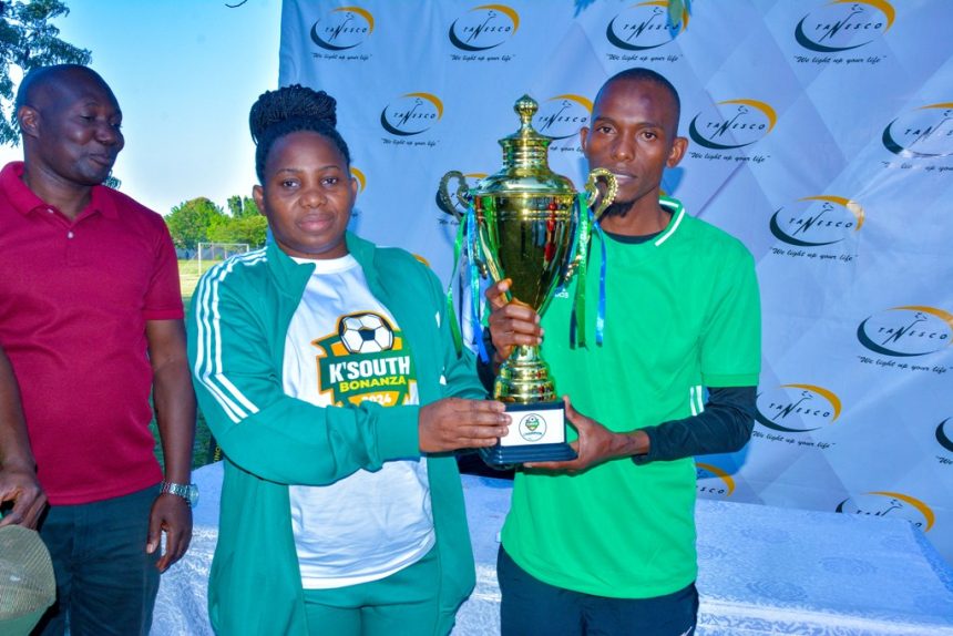 Meneja wa Shirika la Umeme Tanzania (TANESCO) Mkoa wa Kinondoni Kusini Mhandisi Florence Mwakasege (kushoto) akimkabidhi Kombe nahodha wa timu ya mpira wa miguu TANESCO Wilaya ya Kimara baada ya timu hiyo kutwaa Ubingwa katika Bonanza la Usalama na Afya lililofanyika leo Juni 22, 2024 katika Viwanja vya Michezo vya Shule ya Sheria, Dar Dar es Salaam.