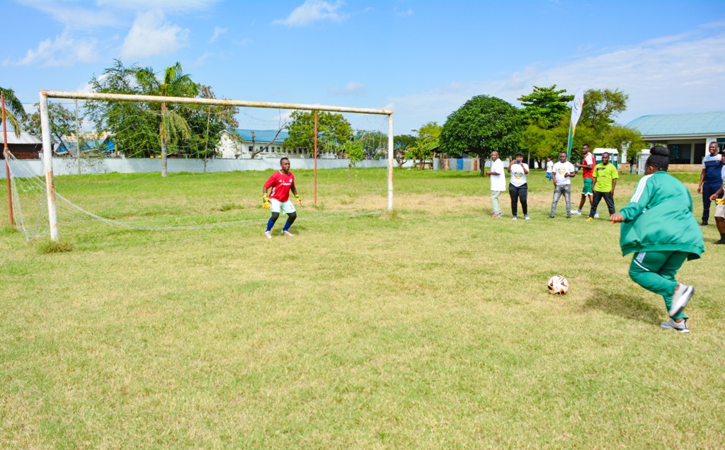 Meneja wa Shirika la Umeme Tanzania (TANESCO) Mkoa wa Kinondoni Kusini Mhandisi Florence Mwakasege (Mwenye koti la kijani) akipiga penati kwenye mpira wa miguu kama ishara ya ufunguzi wa Bonanza la Usalama na Afya lililofanyika leo Juni 22, 2024 katika Viwanja vya Michezo vya Shule ya Sheria, Dar Dar es Salaam.