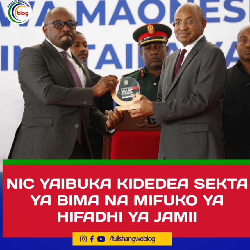 Rais wa Zanzibar na Mwenyekiti wa Barazaa Mapinduzi Dkt. Hussein Ali Mwinyi akimkabidhi tuzo Mkurugenzi Mtendaji wa Shirika la Bima la NIC Bw. Kaimu Mkeyenge baada ha shirika hilo kuibuka Mshindi wa kwanza banda bora kundi la Sekta ya Bima na Mifuko ya Hifadhi ya Jamii katika maonesho ya 48 ya Biashara ya Kimataifa yaliyomalizika Julai 13, 2024 kwenye viwanja vya Julius Nyerere Barabara ya Kilwa maarufu Sabasaba jijini Dar es Salaam