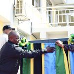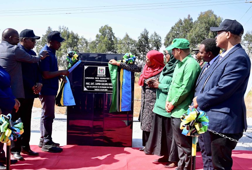 Rais wa Jamhuri ya Muungano wa Tanzania Mhe. Dkt. Samia Suluhu Hassan akivuta kitambaa kuashiria ufunguzi wa barabara ya Sumbawanga-Matai-Kasanga (km107) iliyojengwa kwa kiwango cha lami. Hafla ya ufunguzi wa barabara hiyo imefanyika Matai Wilayani Kalambo Mkoani Rukwa tarehe 16 Julai, 2024.