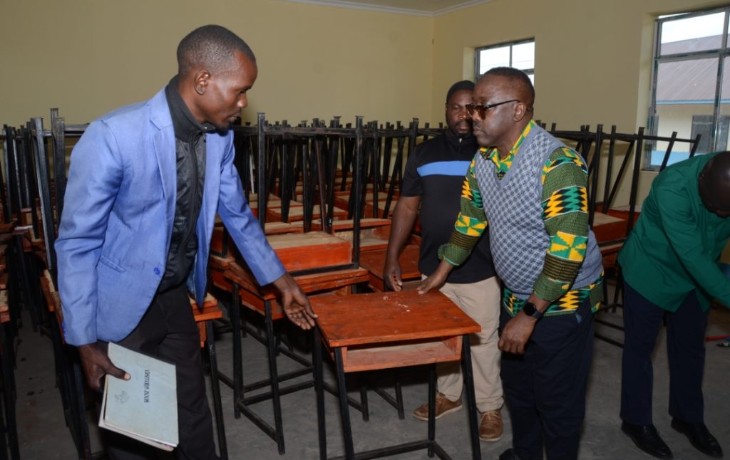 Mbunge wa Jimbo la Namtumbo Vita Kawawa kulia,akikagua ubora wa viti vitakavyotumika na wanafunzi katika shule ya Sekondari Msisima wilayani Namtumbo,kushoto Makamu Mkuu wa shule hiyo John Maduka.