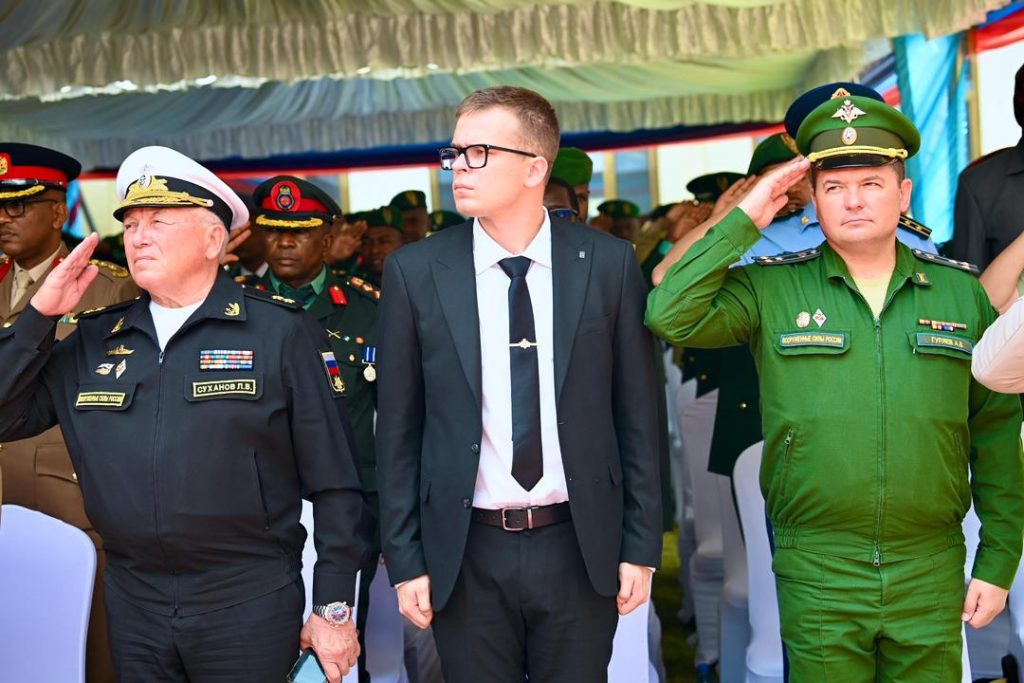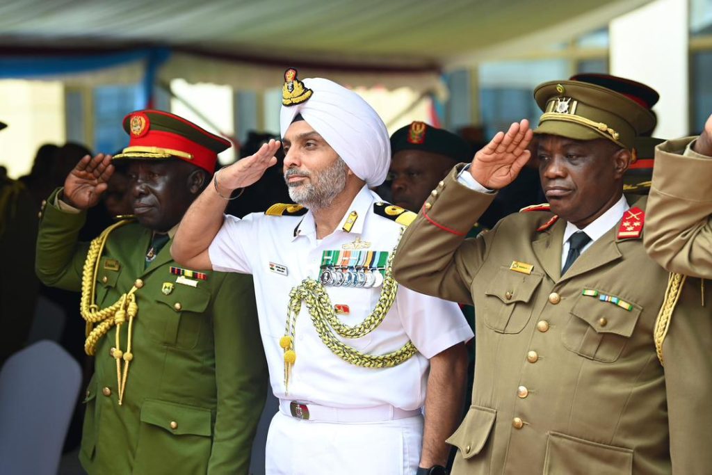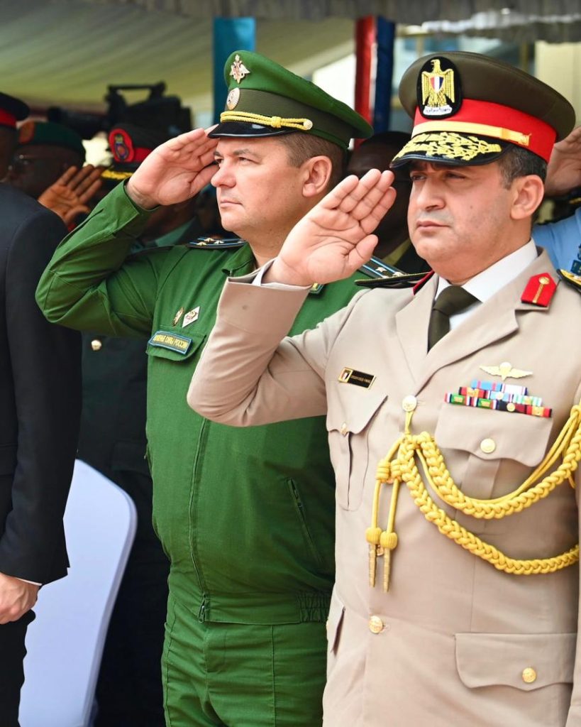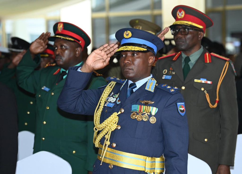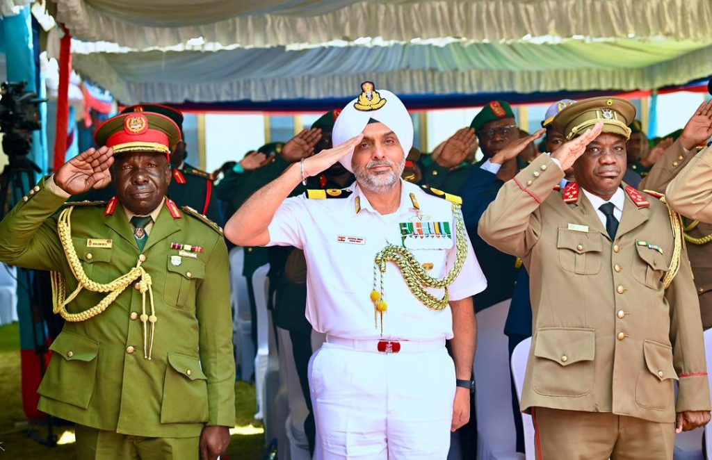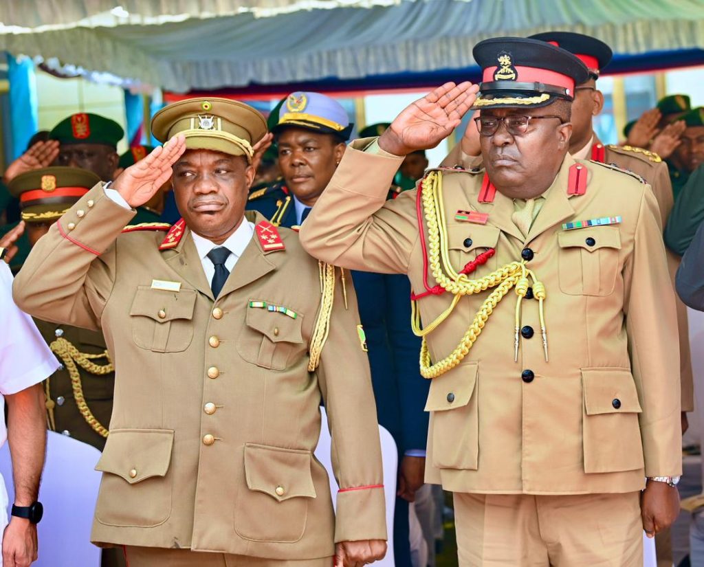 Baadhi ya Waambata Jeshi pamoja na Wahitimu wa Chuo cha Taifa cha Ulinzi (NDC) Kozi ya 12 kwa mwaka 2023/2024 wakiwa wamesimama wakati wa Wimbo wa Taifa wa Tanzania ukiimbwa wakati wa kwenye Mahafali ya Chuo hicho Kunduchi Jijini Dar es Salaam tarehe 27 Julai, 2024.