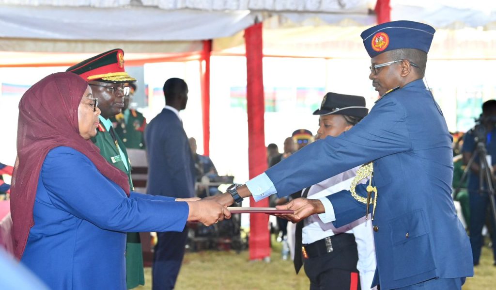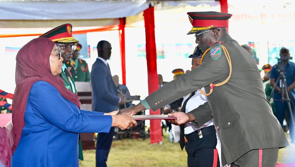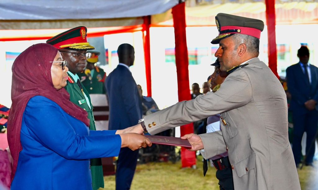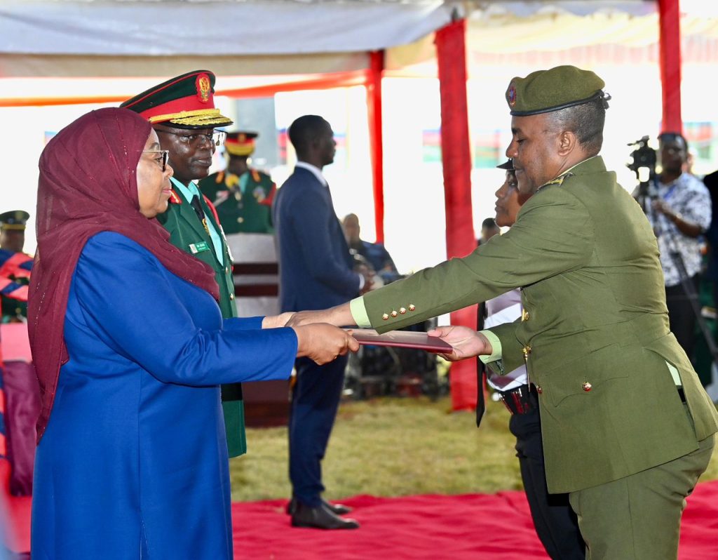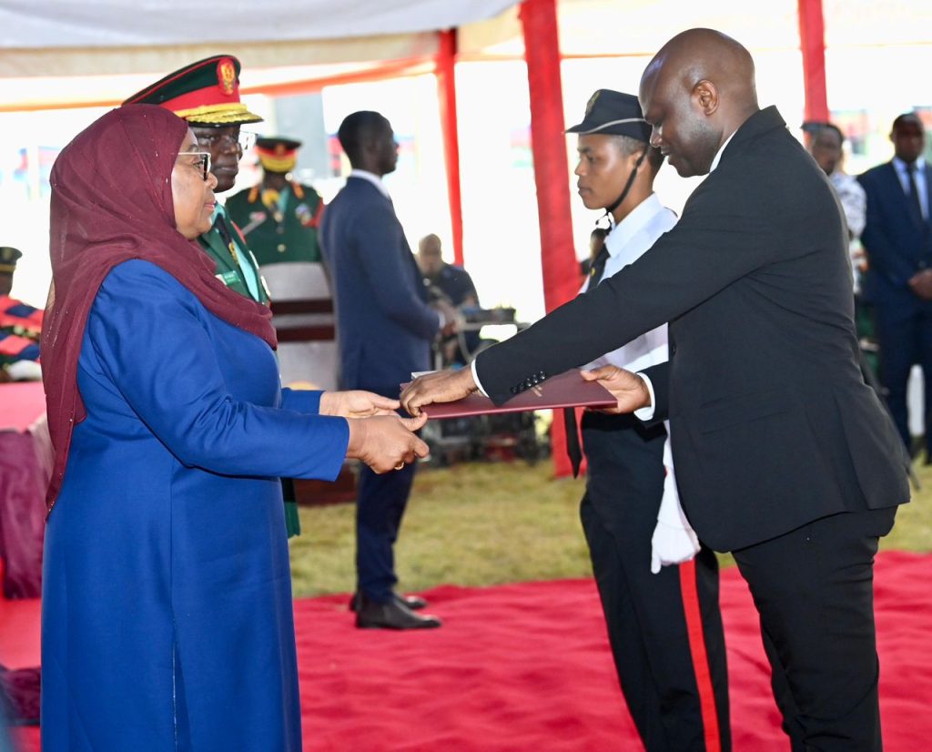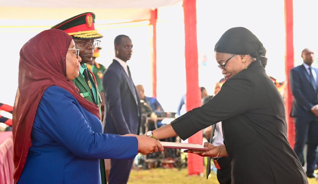 Rais wa Jamhuri ya Muungano wa Tanzania Mhe. Dkt. Samia Suluhu Hassan akiwakabidhi vyeti Wahitimu wa Chuo cha Taifa cha Ulinzi (NDC) Kozi ya 12 kwa mwaka 2023/2024 kwenye Mahafali ya Chuo hicho Kunduchi Jijini Dar es Salaam tarehe 27 Julai, 2024.