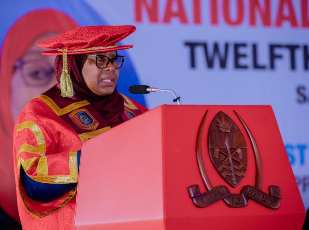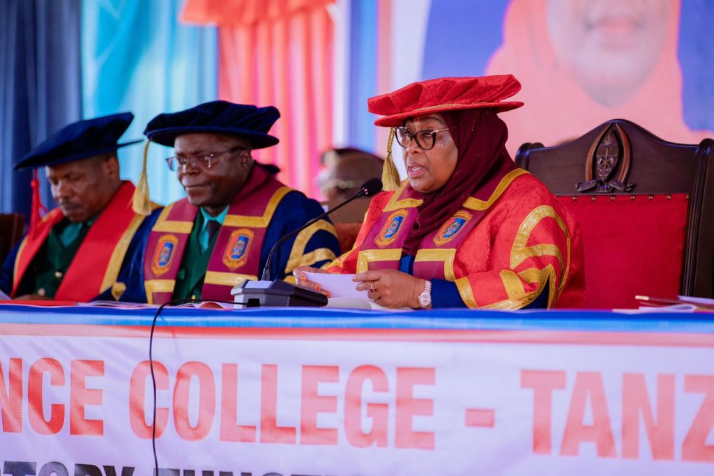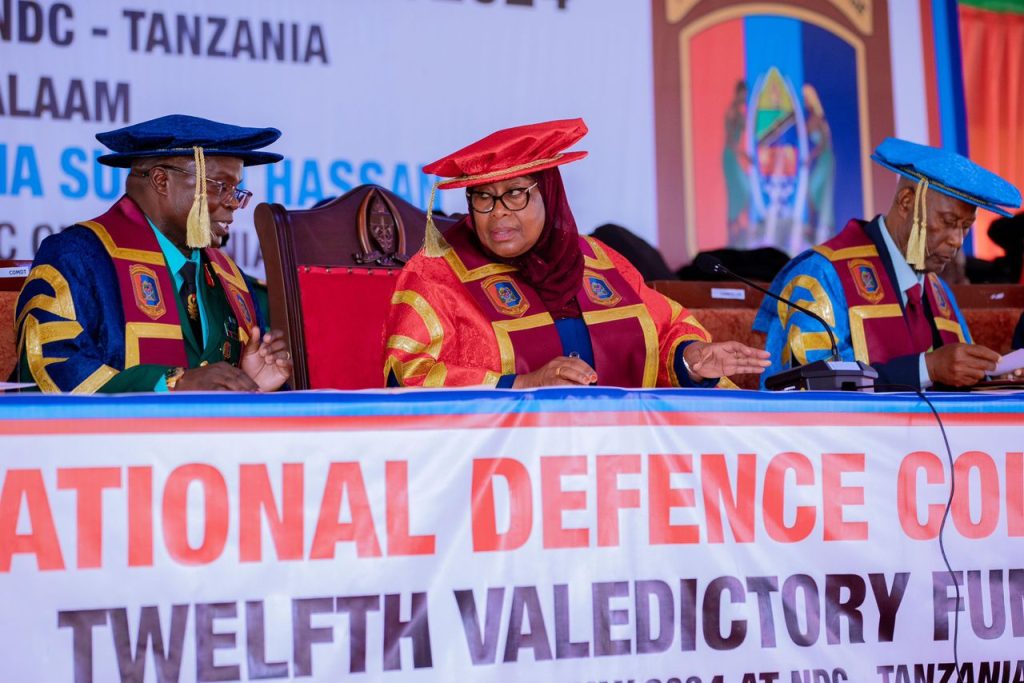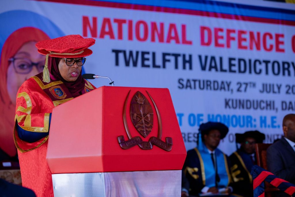 Rais wa Jamhuri ya Muungano wa Tanzania Mhe. Dkt. Samia Suluhu Hassan akizungumza kwenye Mahafali ya Chuo cha Taifa cha Ulinzi (NDC) Kozi ya 12 kwa mwaka 2023/2024, Kunduchi Jijini Dar es Salaam tarehe 27 Julai, 2024