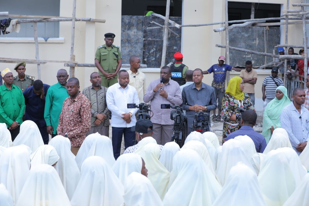Makamu wa Pili wa Rais wa Zanzibar Mhe.Hemed Suleiman Abdulla akizungumza na walimu, wanafunzi na wananchi wa Michakaeni Chake-Chake mara baada ya kukagua maendeleo ya ujenzi wa mradi wa Skuli ya Msingi ya Michakaini “B” inayojengwa ya Ghorofa (G+2) na Mkandarasi Mwinyi Building Construction ikiwa ni muendelezo wa ziara zake za kukagua miradi ya maendeleo inayojengwa Kisiwani Pemba.