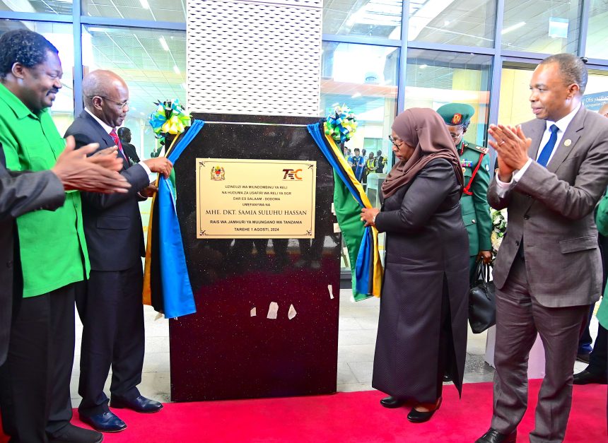 Rais wa Jamhuri ya Muungano wa Tanzania, Mhe. Dkt. Samia Suluhu Hassan akivuta kitambaa kuzindua rasmi Miundombinu ya Reli na Huduma za Usafiri wa Reli ya Kisasa (SGR) kutoka Dar es Salaam hadi Dodoma kwenye hafla iliyofanyika Stesheni ya SGR Mkoani Dodoma tarehe 01 Agosti, 2024.
