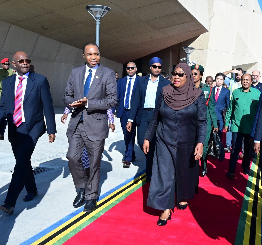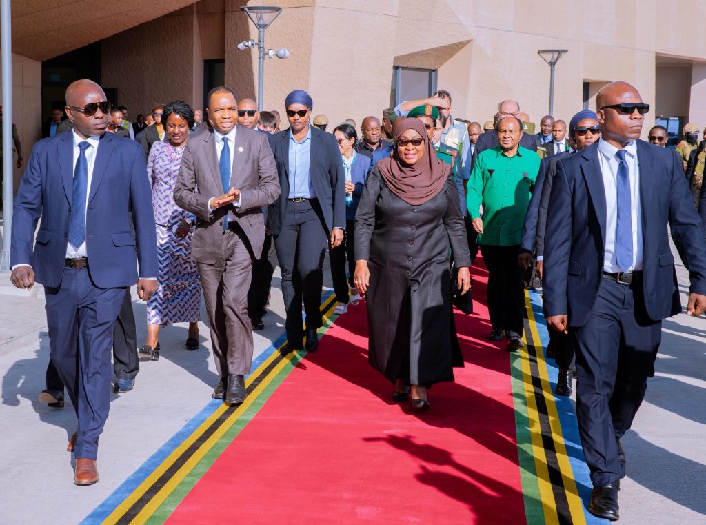Rais wa Jamhuri ya Muungano wa Tanzania, Mhe. Dkt. Samia Suluhu Hassan akiwasili katika Stesheni Kuu ya SGR Dodoma kwa ajili ya hafla ya uzinduzi wa Miundombinu ya Reli na Huduma za Usafiri wa Reli ya Kisasa (SGR) kutoka Dar es Salaam hadi Dodoma