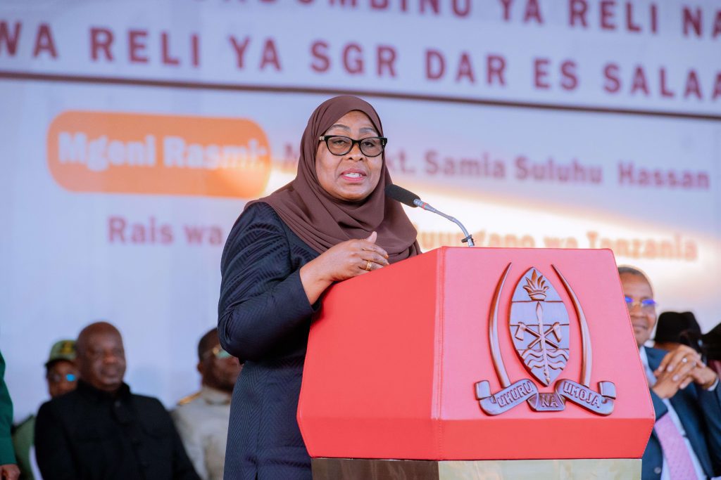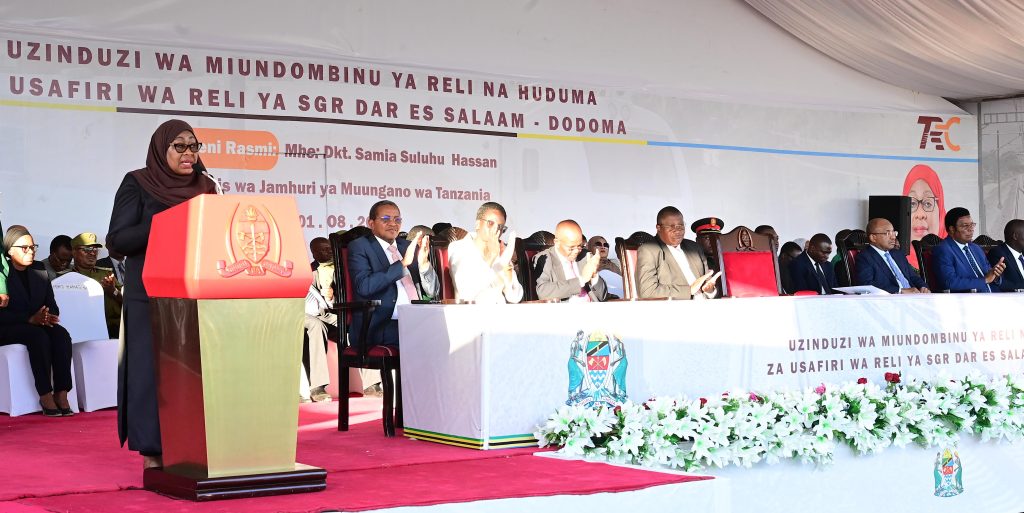 ais wa Jamhuri ya Muungano wa Tanzania, Mhe. Dkt. Samia Suluhu Hassan akihutubia Viongozi, wageni mbalimbali pamoja Wananchi mara baada ya kuzindua Rasmi Miundombinu ya Reli na Huduma za Usafiri wa Reli ya Kisasa (SGR) kutoka Dar es Salaam hadi Dodoma kwenye hafla iliyofanyika katika Stesheni Kuu ya SGR Mkoani Dodoma tarehe 01 Agosti, 2024.
