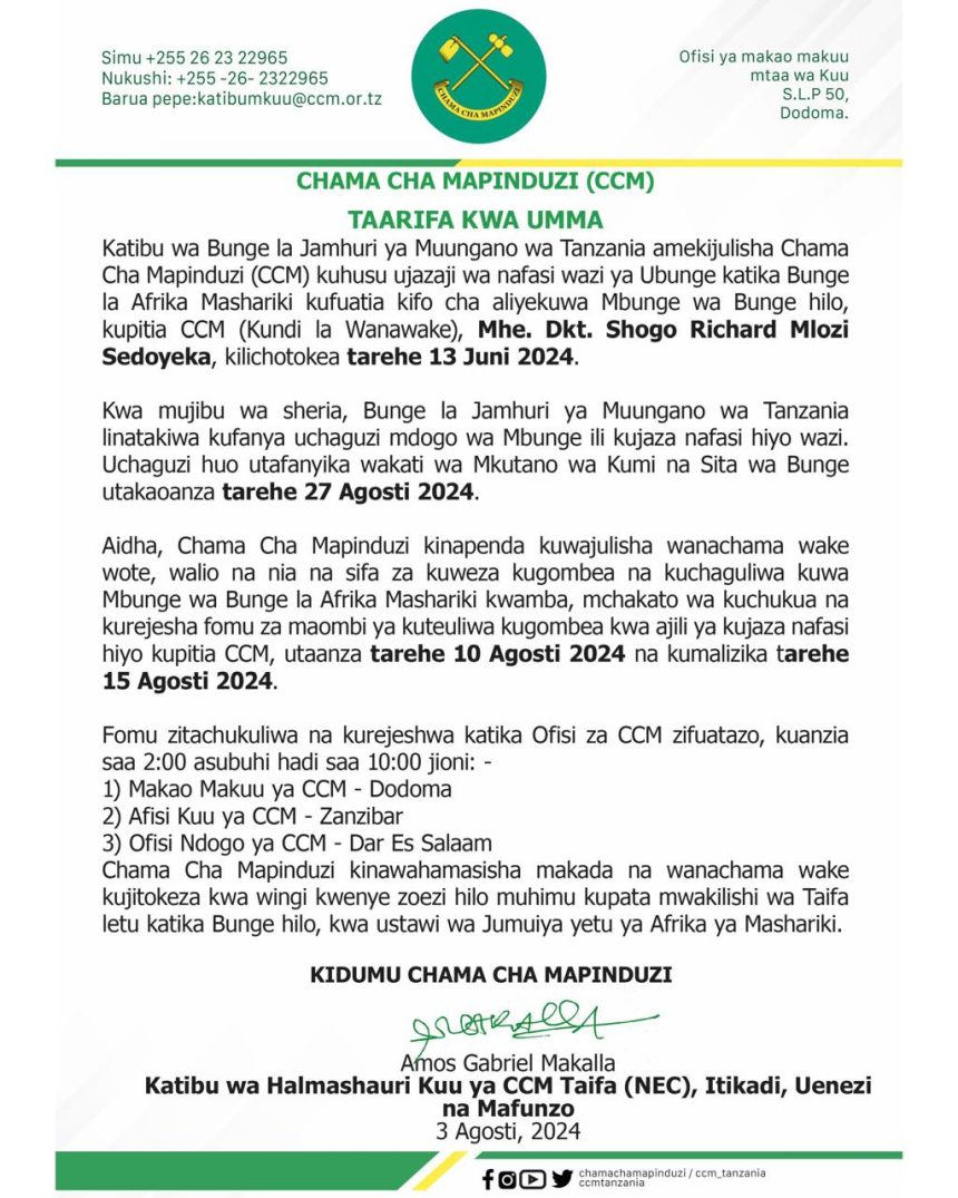 MchanganyikoCCM YAITA WENYE NIA KUGOMBEA UBUNGE EALA Last updated: 2024/08/03 at 6:32 PM Alex Sonna 2 years ago Share SHARE Alex Sonna August 3, 2024 August 3, 2024 Share this Article Facebook Twitter Email Print Previous Article RAIS SAMIA AFUNGUA BARABARA YA KILOSA – RUDEWA MKOANI MOROGORO Next Article RAIS SAMIA AKUTANA NA MWALIMU MARY SANYA WILAYANI KILOSA