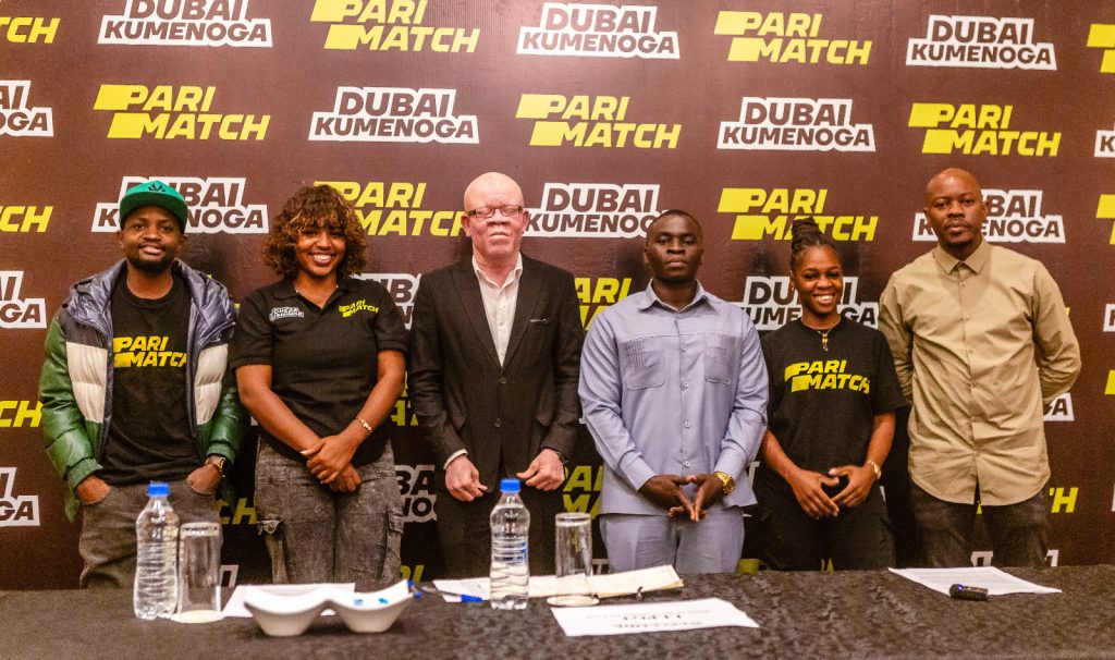 Mkurugenzi wa kampuni ya michezo ya kubashiri ya Parimatch, Eric Gelard (wa pilu kulia) na meneja masoko, Levis Paul wakiwa katika picha ya pamoja na mabalozi mbalimbali wa kampuni hiyo wakiongozwa na Haji Manara ( wa tatu kushoto) wakati wa uzinduzi wa promosheni ya Dubai Kumenoga ambayo itawawezesha jumla ya washindi nane kutembelea nchini Dubai. Wengine katika picha ni Asma Majid “Silivestery” (wa pili kulia), Vicent Njau ‘Kiredio’ ( wa kwanza kulia) na Ester Luckson “Mama Chanja” wa pili kushoto.