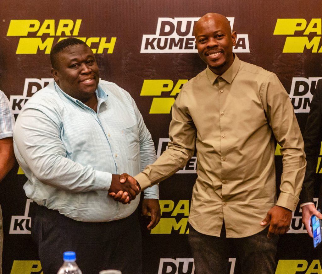 Meneja Masoko wa kampuni ya michezo ya kubashiri ya Parimatch, Levis Paul (kulia) akipongezana na mmoja wa maofisa wa kampuni ya mtandao wa simu ya Airtel wa kitengo cha Airtel Money, George Majumba wakati wa uzinduzi wa promosheni ya Dubai Kumenoga ambayo itawawezesha jumla ya washindi nane kutembelea nchini Dubai