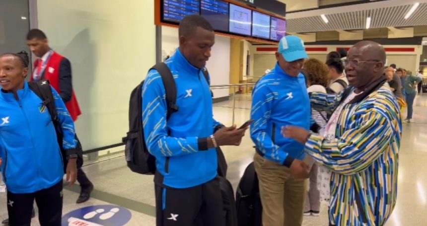 Makamu wa Rais wa Kamati ya Olimpiki ya Tanzania (TOC) Henry Tandau akiwalaki kwa furaha wanariadha wanne wa Tanzania watakaoshiriki katika mbio za Marathon za mashindano ya Olimpiki ya Paris 2024 siku za Jumamosi na Jumapili.