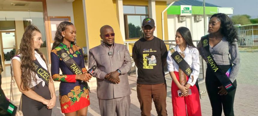 Mkuu wa Wilaya ya Simanjiro Mkoani Manyara, Fakii Raphael Lulandala (watatu kushoto) akizungumza juu ya ziara ya warembo wa Miss Travel World 2024 walipotembelea mji mdogo wa Mirerani.