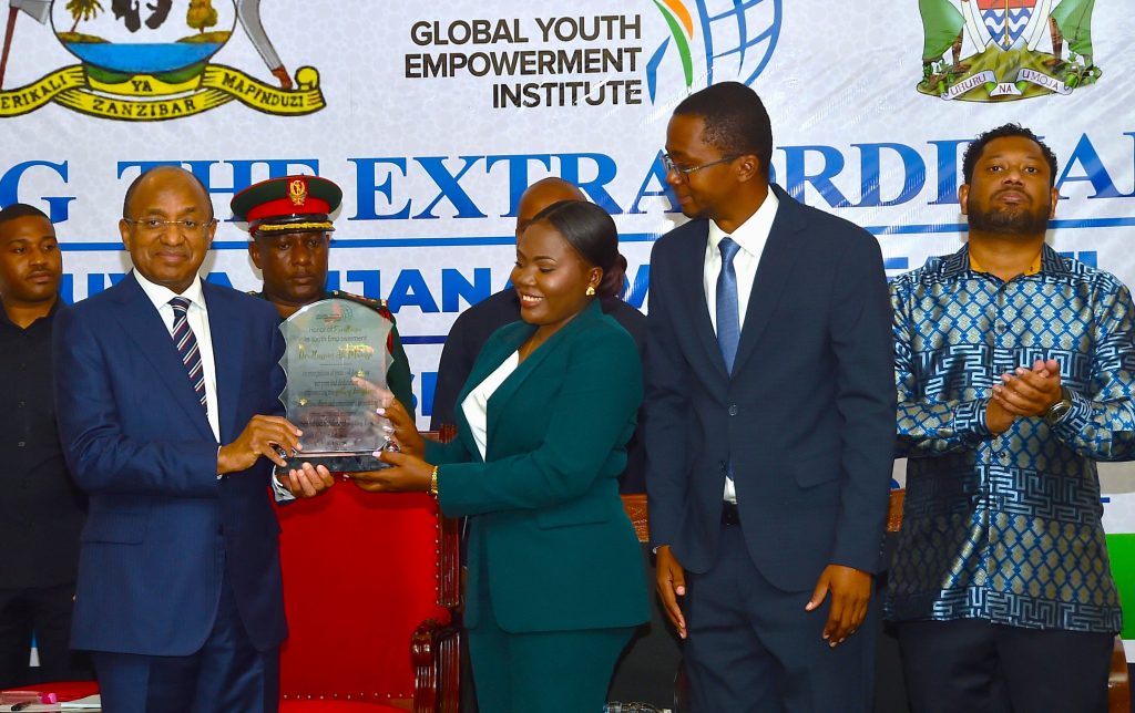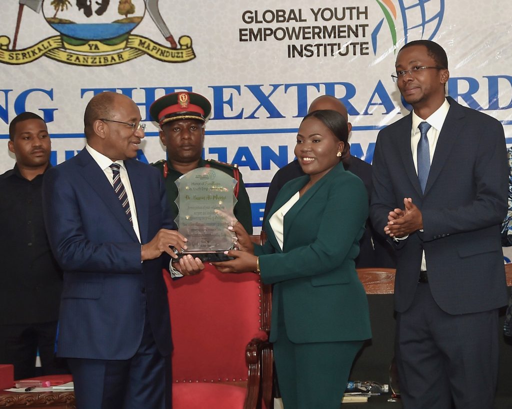 RAIS wa Zanzibar na Mwenyekiti wa Baraza la Mapinduzi Mhe.Dk.Hussein Ali Mwinyi akikabidhiwa Tuzo Maalum kwa Mchango wake kwa Vijana, akikabidhiwa na Muazilishi wa Taasisi ya Global Youth Empowerment Institute. Amina Sanga, baada ya kulifungua Kongamano la Kitaifa la Kuwawezesha Vijana, lililofanyika katika ukumbi wa Hoteli ya Zanzibar Beach Resort Mazizini Zanzibar, Wilaya ya Magharibi “B” Unguja leo 10-8-2024.(Picha na Ikulu)