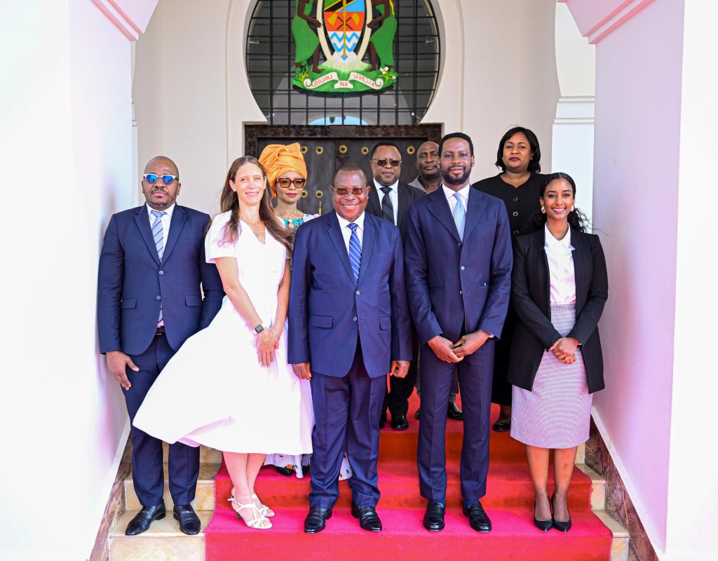 Makamu wa Rais wa Jamhuri ya Muungano wa Tanzania Mhe. Dkt. Philip Mpango akiwa katika picha ya pamoja na Ujumbe wa Sekretariet ya Jukwaa la Uchumi Duniani (WEF) wakiongozwa na Mkurugenzi wa Masuala ya Ushirikiano katika Usimamizi na Menejimenti ya Taka za Plastiki Bi. Clemence Schmid (mwenye gauni jeupe) pamoja na ujumbe wa Tanzania mara baada ya mazungumzo yaliyofanyika Ikulu Chamwino Mkoani Dodoma tarehe 15 Agosti 2024.