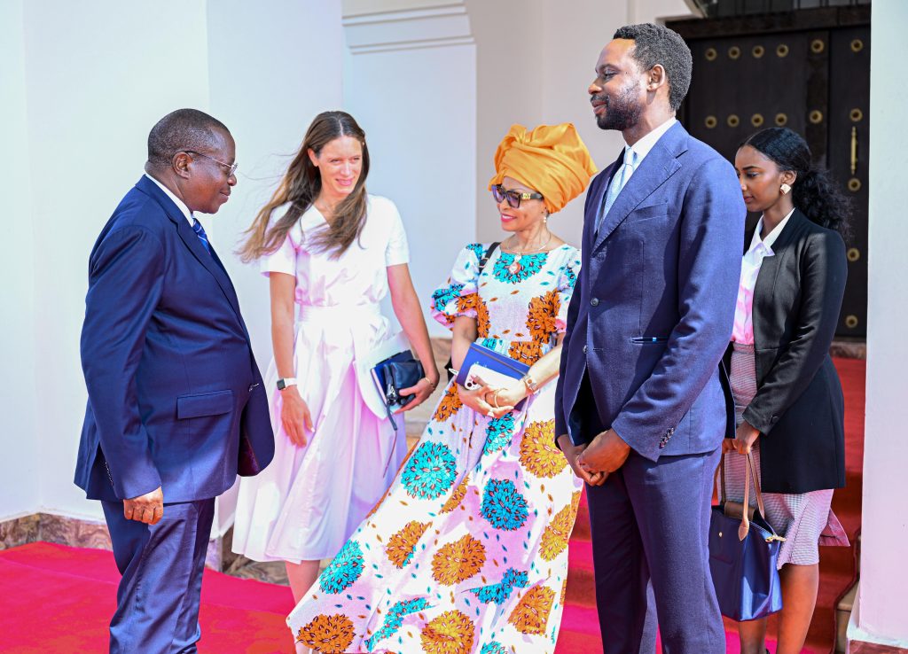 Makamu wa Rais wa Jamhuri ya Muungano wa Tanzania Mhe. Dkt. Philip Mpango akiagana na Ujumbe wa Sekretariet ya Jukwaa la Uchumi Duniani (WEF) wakiongozwa na Mkurugenzi wa Masuala ya Ushirikiano katika Usimamizi na Menejimenti ya Taka za Plastiki Bi. Clemence Schmid (mwenye gauni jeupe) mara baada ya mazungumzo yaliyofanyika Ikulu Chamwino Mkoani Dodoma tarehe 15 Agosti 2024.