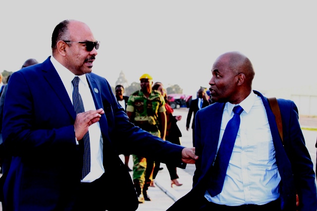 Waziri wa Mambo ya nje na Ushirikiano wa Afrika Mashariki Mh. Mahmoud Thabit Kombo akizungumza na Dkt. Faustine Ndungulie kwenye uwanja wa ndege wa Robert Mugabe jijini Harare leo amempigia debe kwenye kikao cha mawaziri.