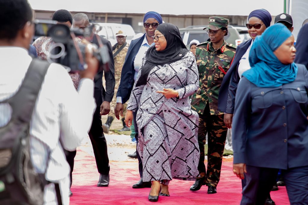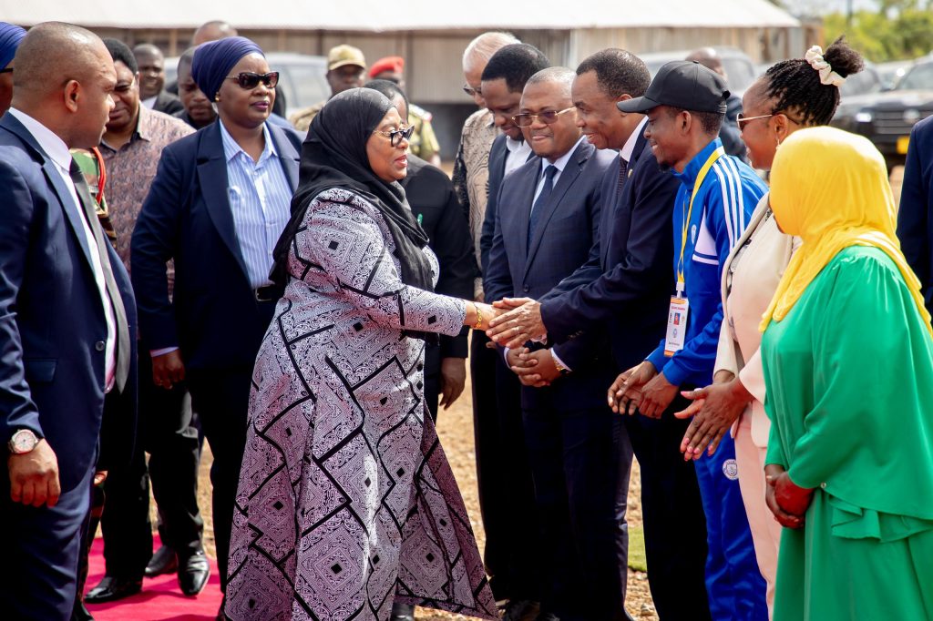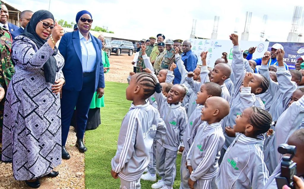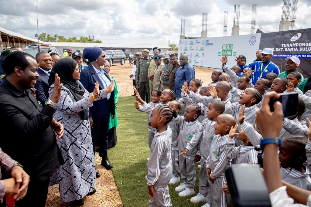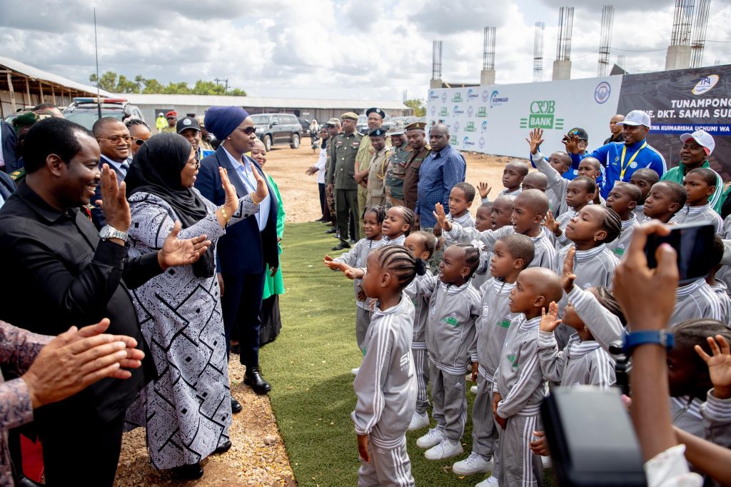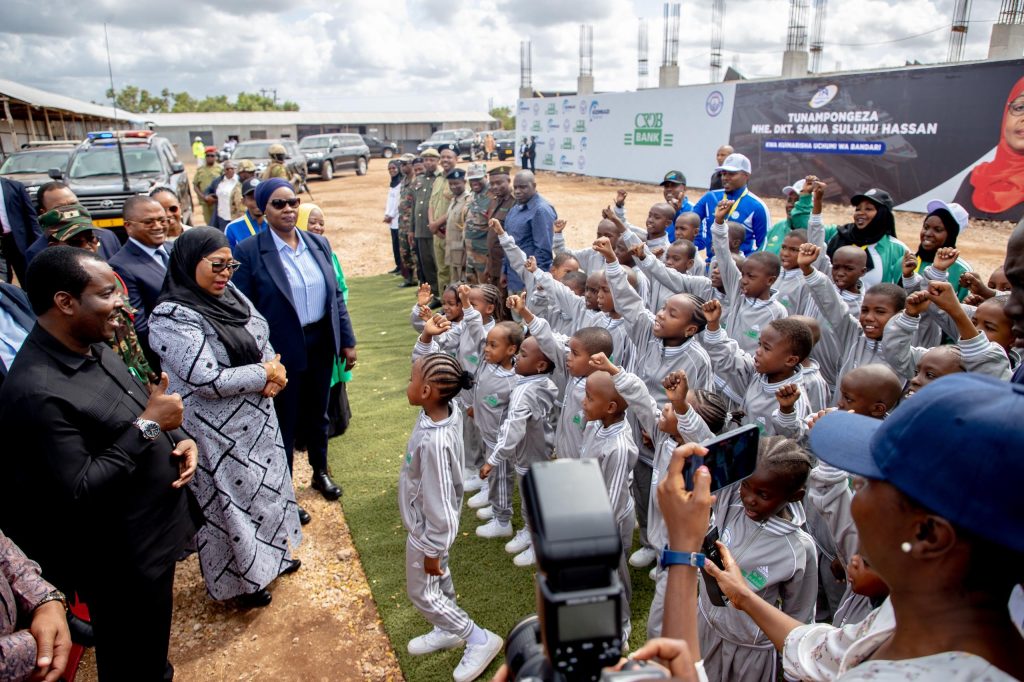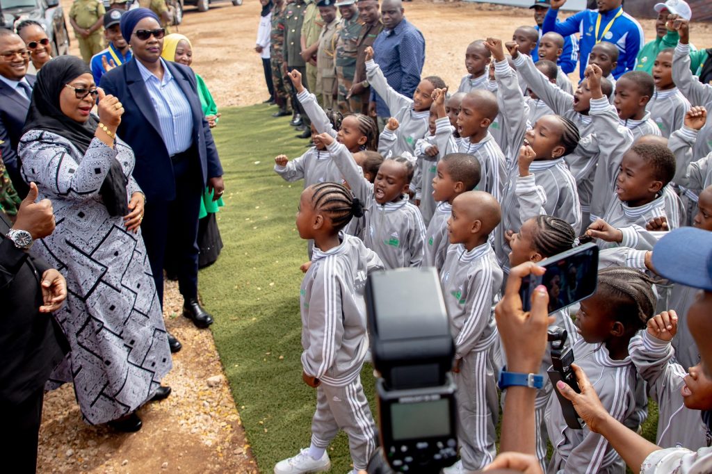Rais wa Jamhuri ya Muungano wa Tanzania, Mhe. Dkt. Samia Suluhu Hassan akiwasikiliza Watoto wa Suluhu Sports Academy wakiimba mara baada ya kuwasili katika eneo la mradi, Kizimkazi Zanzibar tarehe 22 Agosti, 2024.