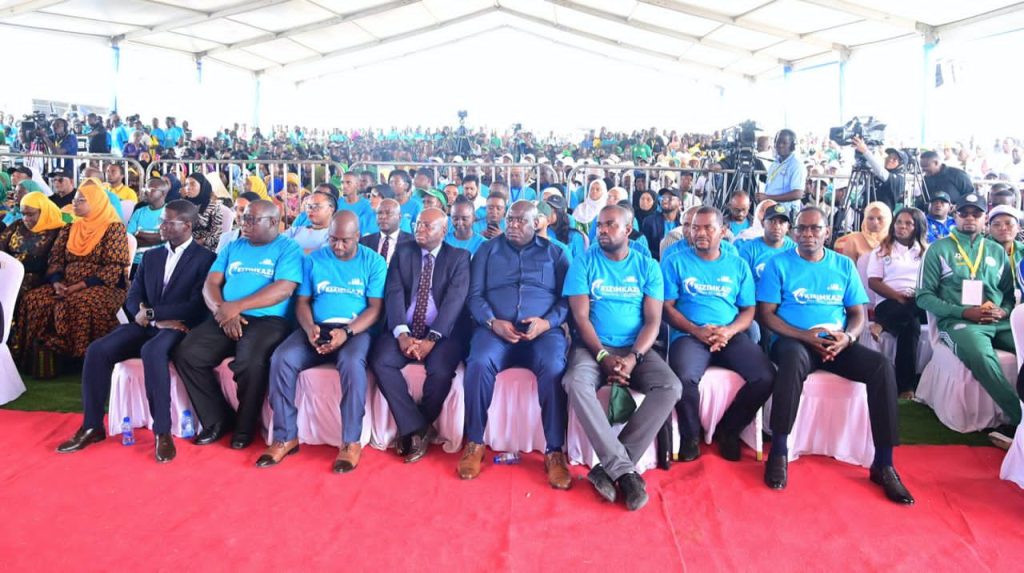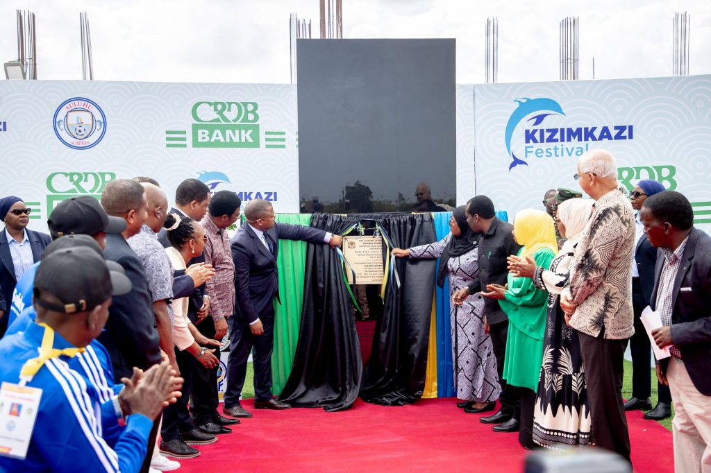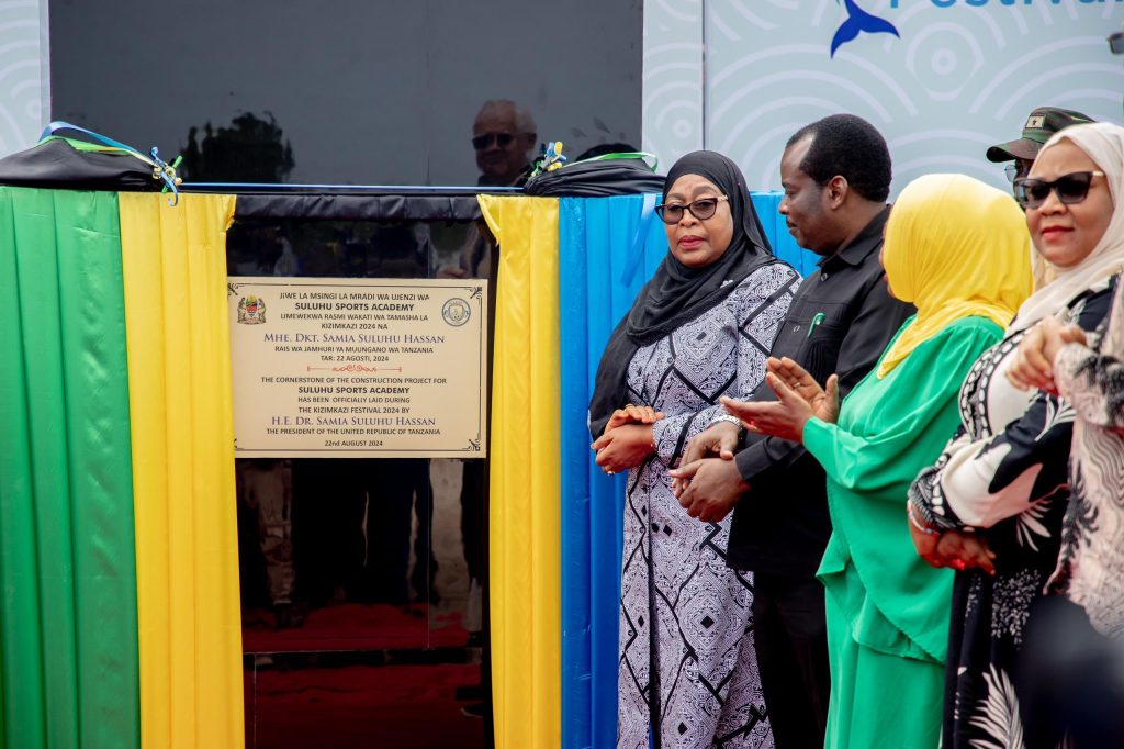 Rais wa Jamhuri ya Muungano wa Tanzania, Mhe. Dkt. Samia Suluhu Hassan akiweka jiwe la Msingi la ujenzi wa Suluhu Sports Academy katika eneo la Kizimkazi wakati wa shamrashamra za Tamasha la Kizimkazi, Zanzibar tarehe 22 Agosti, 2024.