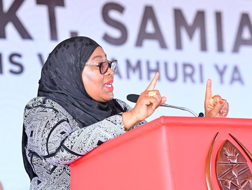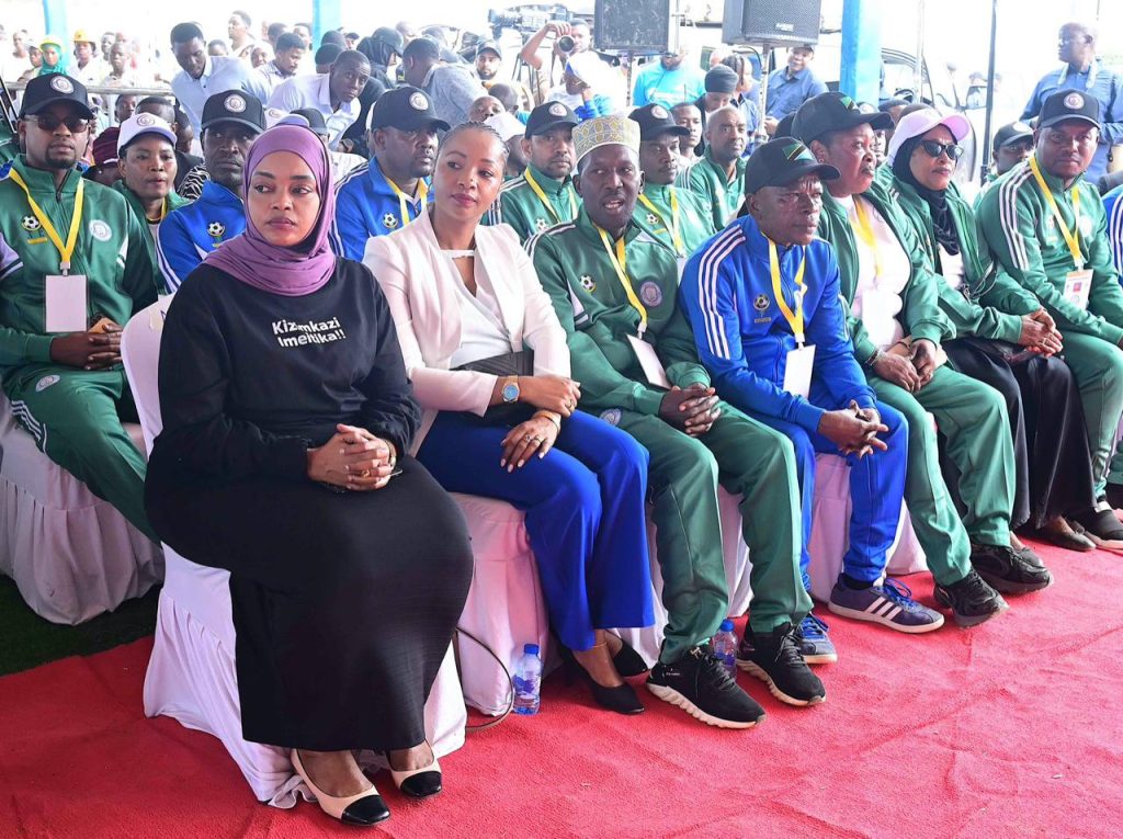 Rais wa Jamhuri ya Muungano wa Tanzania, Mhe. Dkt. Samia Suluhu Hassan akizungumza na viongozi mbalimbali pamoja na Wananchi mara baada ya kuweka jiwe la Msingi ujenzi wa Suluhu Sports Academy katika eneo la Kizimkazi, Zanzibar tarehe 22 Agosti, 2024.