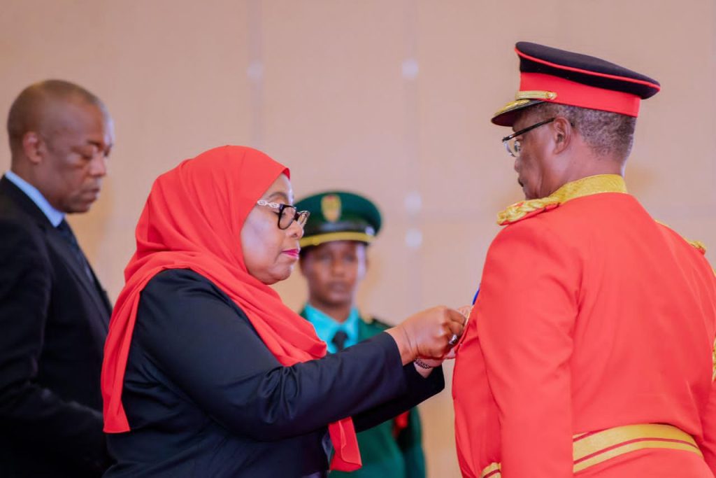 Rais wa Jamhuri ya Muungano wa Tanzania na Amiri Jeshi Mkuu Mhe. Dkt. Samia Suluhu Hassan akiwatunuku Nishani ya miaka 60, Mkuu wa Majeshi ya Ulinzi Tanzania (CDF) Jenerali Jacob John Mkunda, Majenerali, Maafisa pamoja na Askari wa Jeshi la Wananchi wa Tanzania kwenye hafla iliyofanyika Ikulu Jijini Dar es Salaam tarehe 29 Agosti, 2024.