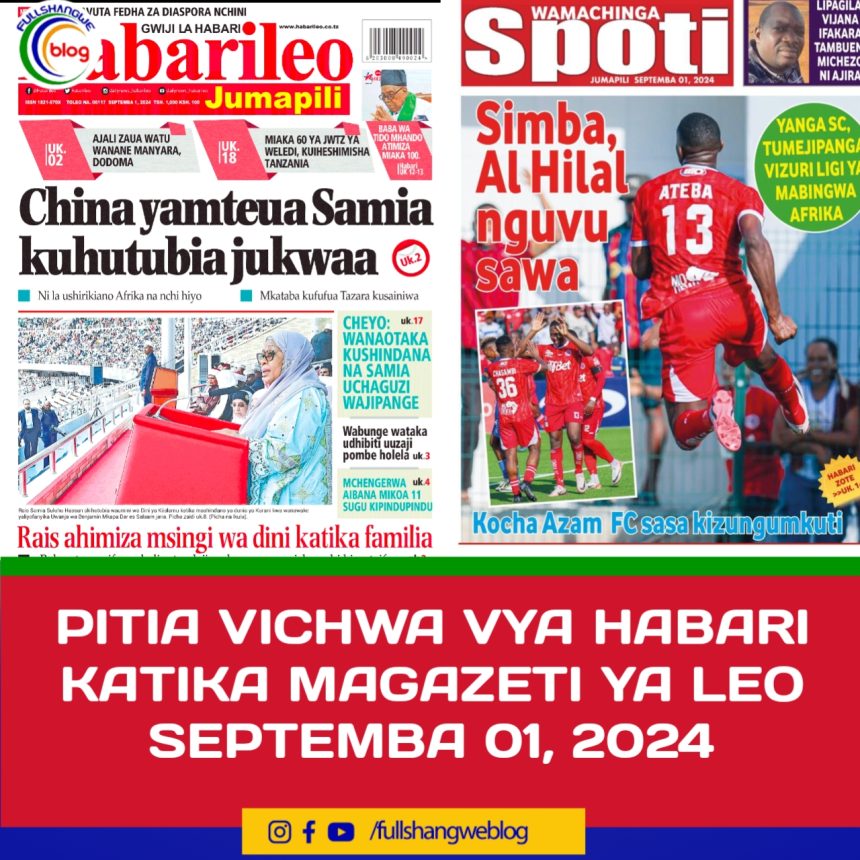 MagazetiPITIA VICHWA VYA HABARI KATIKA MAGAZETI YA LEO SEPTEMBA 01, 2024 Last updated: 2024/08/31 at 11:34 PM John Bukuku 2 years ago Share SHARE John Bukuku August 31, 2024 August 31, 2024 Share this Article Facebook Twitter Email Print Previous Article MWENYEKITI WA CCM RAIS DKT. SAMIA KUONGOZA KIKAO CHA KAMATI KUU KESHO SEPTEMBA 1, 2024 Next Article DKT. TULIA ASISITIZA MATUMIZI YA NISHATI SAFI YA KUPIKIA NCHINI