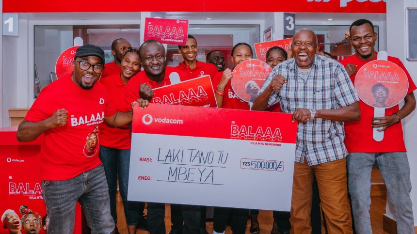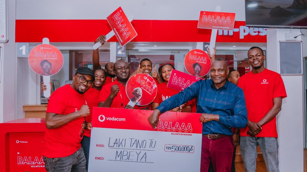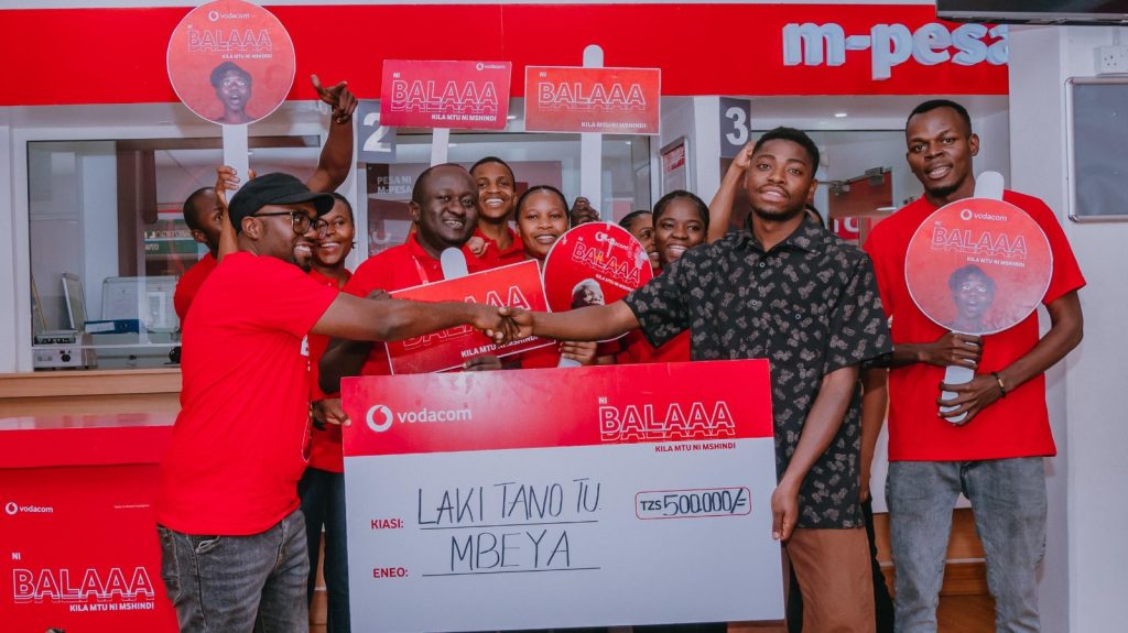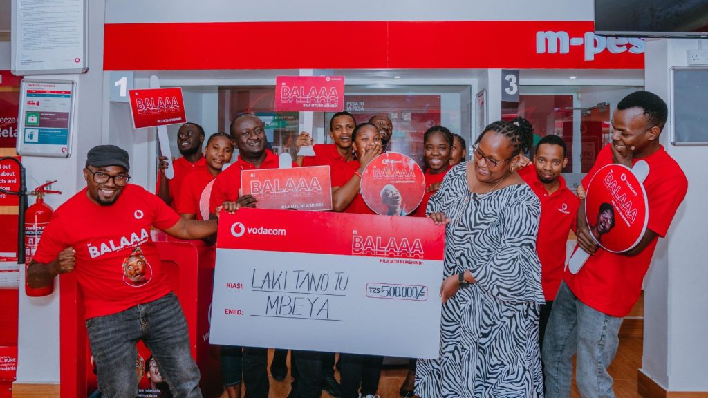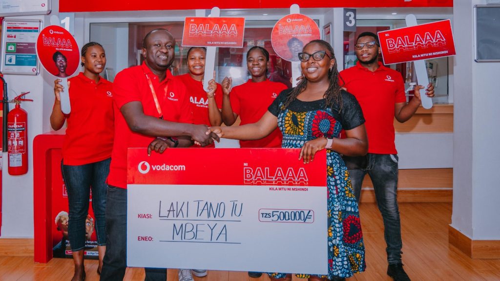 Ni Balaa! Mshindi wa droo ya tano ya kampeni ya Ni Balaa, Kila Mtu Ni Mshindi kutoka Vodacom Tanzania Plc, Mpale Ephraim (wa pili kulia), akipokea mfano wa hundi ya Shilingi laki tano kutoka kwa Mkuu wa Kanda ya Nyanda za Juu Kusini wa kampuni hiyo, Abednego Mhagama (kushoto) katika Duka la Vodacom lililopo Jijini Mbeya mwishoni mwa wiki. Kupitia kampeni hii wateja wa Vodacom wanajiongezea nafasi za kushinda kila wakinunua vifurushi au kufanya miamala kupitia M-pesa Super App.