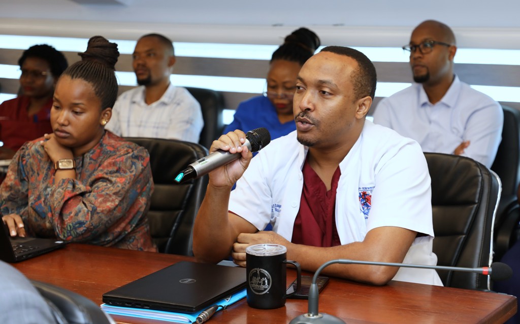 Mkuu wa Kitengo cha Utafiti na Mafunzo wa Taasisi ya Moyo Jakaya Kikwete (JKCI) Dkt. Pedro Pallangyo akielezea namna kitengo hicho kimejipanga kuendelea kufanya tafiti mbalimbali wakati wa kikao cha wafanyakazi kilichofanyika leo katika ukumbi wa Taasisi hiyo iliyopo jijini Dar es Salaam.