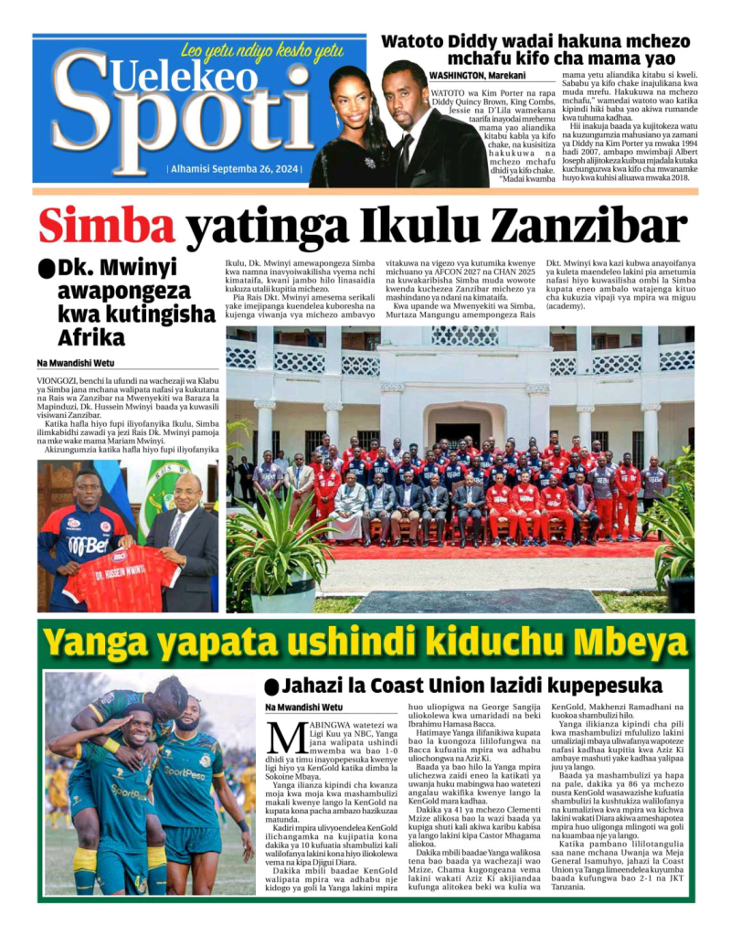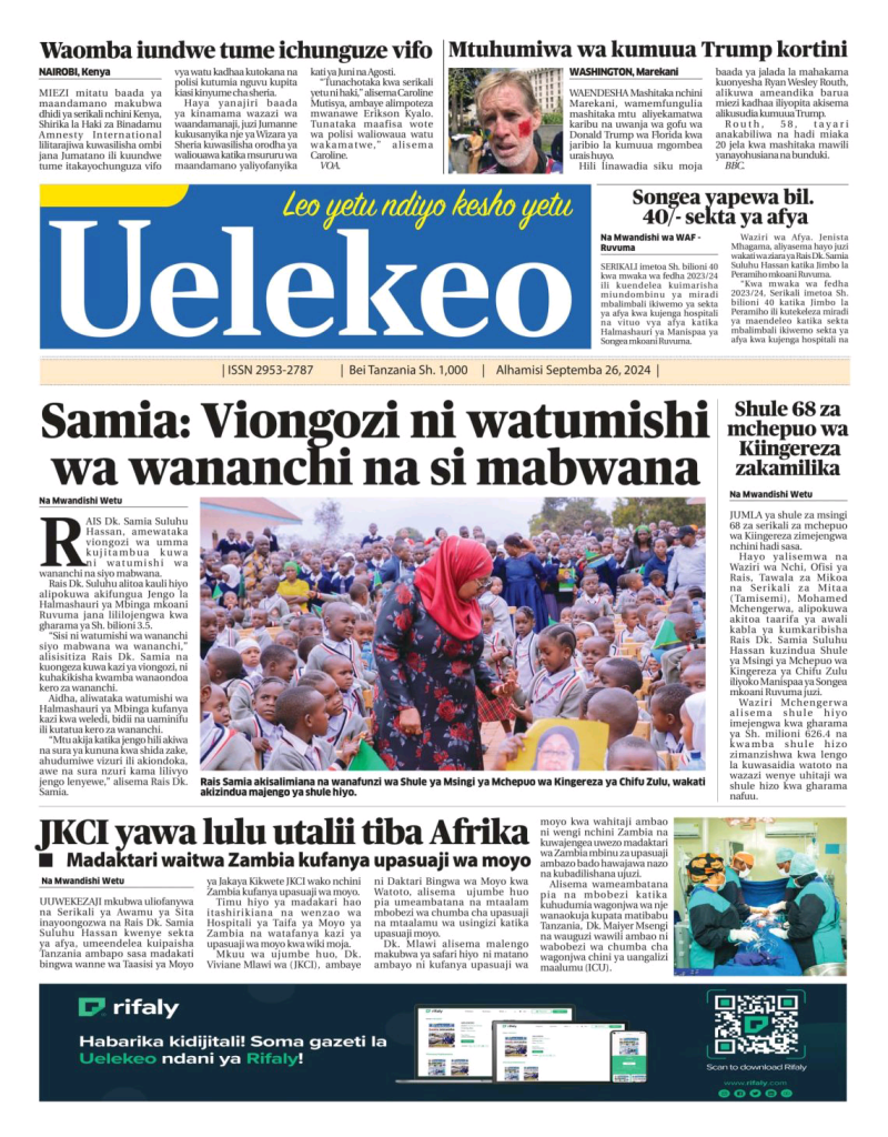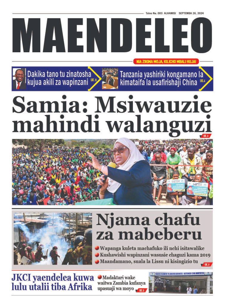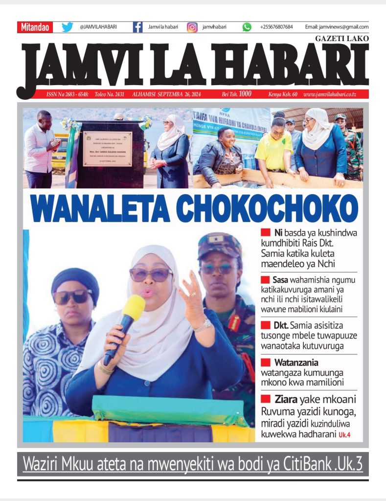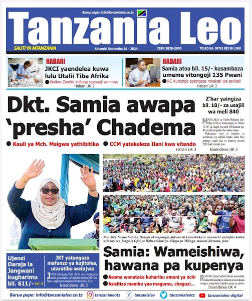 MagazetiPITIA VICHWA VYA HABARI KATIKA MAGAZETI YA LEO SEPETEMBA 26, 2024 Last updated: 2024/09/26 at 3:23 AM John Bukuku 1 year ago Share SHARE John Bukuku September 26, 2024 September 25, 2024 Share this Article Facebook Twitter Email Print Previous Article VIONGOZI WA DINI WAHIMIZWA KUSIMAMIA ULINZI WA AMANI NCHINI – DKT. BITEKO Next Article RAIS SAMIA AFANYA UTEUZI WA WENYEVITI WA BODI ZA MASHIRIKA NA TAASISI ZA SERIKALI