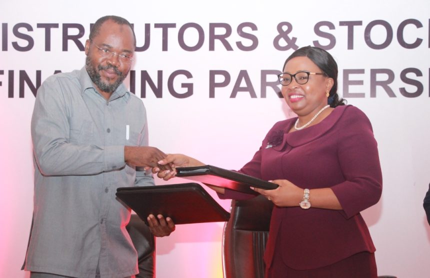 Mkurugenzi wa Biashara wa Benki ya Equity, Leah Ayoub na Mkurugenzi wa Uhusiano wa Bakhresa Group, Hussein Sufiani wakibadilishana hati za makubaliano ya mpango maalum wa mikopo kwa wafanyabiashara.