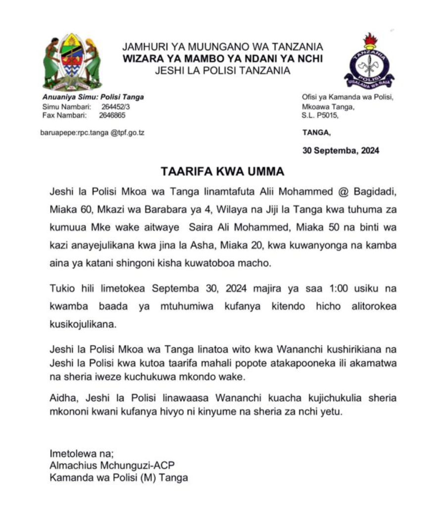 MchanganyikoTAARIFA YA KAMANDA WA POLISI KUTOKA MKOA WA TANGA Last updated: 2024/10/01 at 3:43 AM John Bukuku 1 year ago Share SHARE John Bukuku October 1, 2024 October 1, 2024 Share this Article Facebook Twitter Email Print Previous Article NDEGE YA KWANZA KUTENGENEZWA TANZANIA YAANZA SAFARI ZAKE Next Article DC SAME AWATAKA WASIMAMIZI WA UCHAGUZI WA SERIKALI ZA MITAA KUJIEPUSHA NA RUSHWA