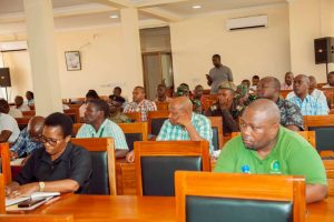 Baadhi ya wadau wakimsikiliza Mkuu wa Mkoa wa Mtwara Kanali Patrick Sawala (hayupo pichani) akizungumza wakati wa hafla ya kumtambulisha Mkandarasi Kampuni ya Northern Engineering Works Ltd ya Arusha aliyeshinda zabuni ya kusambaza umeme katika vitongoji 150 Mkoani Mtwara.