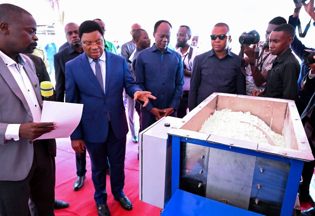 Waziri Mkuu, Kassim Majaliwa akitazama mtambo wa kuchanganya lishe katika vyakula alipotembelea banda la maonesho la Taasisi ya GAIN Tanzania kabla ya kufunga Mkutano Mkuu wa kumiwa Wadau wa Lishe kwenye ukumbi wa Malaika Beach Resort jijini Mwanza, Oktoba 3, 2024. Wa pili kushoto ni Waziri wa Nchi, Ofisi ya Waziri Mkuu Sera, Bunge na Uratibu, William Lukuvi na kushoto ni Meneja Mradi wa GAIN Tanzania, Archard Ngemera. (Picha na Ofisi ya Waziri Mkuu)