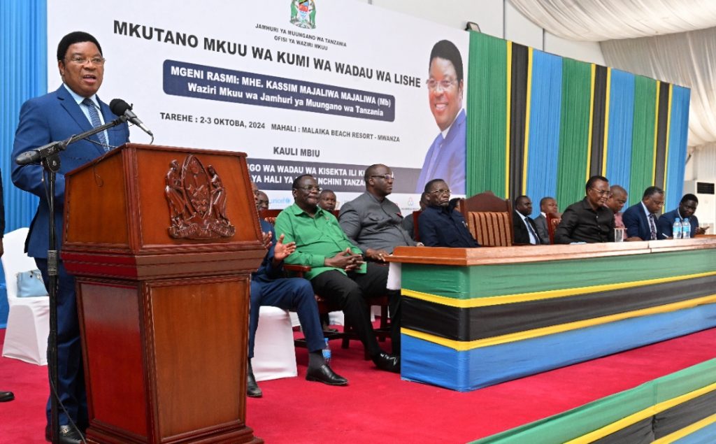 Waziri Mkuu, Kassim Majaliwa akizungumza alipofungua Mkutano Mkuu wa Kumi wa Wadau wa Lishe kwenye ukumbi wa Malaika Beach Resort jijini Mwanza, Oktoba 3, 2024.(Picha na Ofisi ya Waziri Mkuu)