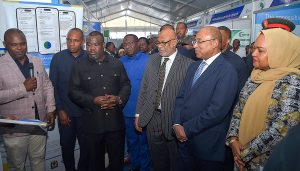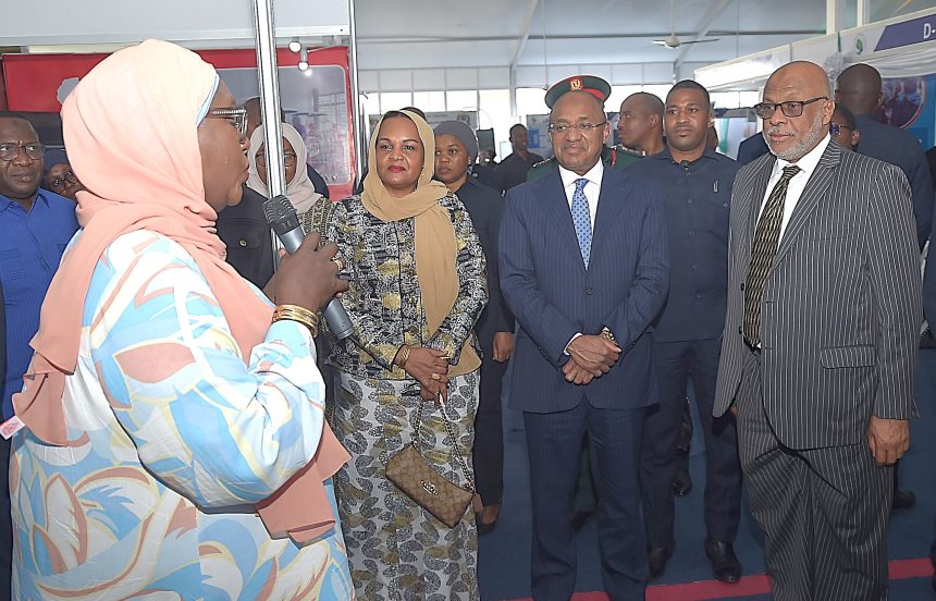 RAIS wa Zanzibar na Mwenyekiti wa Baraza la Mapinduzi Mhe.Dk.Hussein Ali Mwinyi akiwa na Mkewe Mama Mariam Mwinyi wakimsikiliza Dr.Amy Niambo Ndao Fall wa Taasisi ya “Sanofi Global Health Unit”. Wakati akitembelea maonesho ya Tanzania Health Summit, kabla ya kuufungua mkutano huo wa 11, uliyofanyika katika ukumbi wa viwanja vya Maonesho Dimani Wilaya ya Magharibi “B”Unguja na (kushoto kwa Rais) Waziri wa Afya Zanzibar Mhe.Nassor Ahmed Mazrui.(Picha na Ikulu)