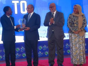 RAIS wa Zanzibar na Mwenyekiti wa Baraza la Mapinduzi Mhe.Dk.Hussein Ali Mwinyi akikabidhiwa TUZO Maalumu ya kuthamini Mchango wake katika Sekta ya Afya, iliyotolewa na Tanzania Health Summit, akikabidhiwa na Muazilishi wa Taasisi hiyo Dr.Omar Chilo, wakati wa hafla ya ufungaji wa Mkutano huo wa 11 uliyofanyika katika ukumbi wa Viwanja vya Maonesho Dimani Wilaya ya Magharibi “B”Unguja, na (kushoto kwa Rais) Waziri wa Afya Zanzibar Mhe.Nassor Ahmed Mazrui na Mke wa Rais wa Zanzibar Mama Mariam Mwinyi.(Picha na Ikulu)