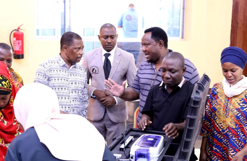 Makamu Mwenyekiti wa Tume Huru ya Taifa ya Uchaguzi, Mhe. Jaji Rufaa (Mstaafu) Mbarouk Salim Mbarouk (kulia) akifurahia jambo wakati alipotembelea kituo cha mafunzo ya Waandishi Wasaidizi na Waendesha Vifaa vya Bayometriki katika Wilaya ya Micheweni Mkoa wa Kaskazini Pemba leo Oktoba 5, 2024 katika siku ya pili ya mafunzo hayo. Mafunzo hayo yanafanyika ikiwa ni maandalizi ya mzunguko wa sita wa uboreshaji wa Daftari la Kudumu la Wapiga Kura ambao utajumuisha mikoa mitano ya Zanzibar ambapo Uboreshaji wa Daftari kwenye maeneo hayo utaanza Oktoba 07 hadi Oktoba 13, 2024 na vituo vitakuwa vinafunguliwa kuanzia saa 2:00 asubuhi na kufungwa saa 12:00 jioni. (Picha na INEC).