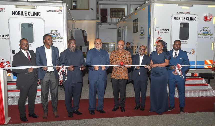 RAIS wa Zanzibar na Mwenyekiti wa Baraza la Mapinduzi Mhe.Dk.Hussein Ali Mwinyi akipata akimsikiliza kutoka kwa Muungazi Asha Ramadhan Said, alipotembelea gari maalumu la kuhudumia wagonjwa,lililotolewa na Amref Tanzania kwa Wizara ya Afya, wakati wa hafla ya kuzindua Kampeni ya Uzazi ni Maisha uliofanyika katika viwanja vya Ikulu Jijini Zanzibar na (kushoto kwa Rais) Mkurugezi Mkaazi wa Amref Tanzania Dkt. Florence Temu na (Kulia kwa Rais) Mwenyekiti wa Bodi ya Amref Tanzania Anthony Chamungwana na Waziri wa Afya Zanzibar Mhe.Nassor Ahmed Mazrui.(Picha na Ikulu)