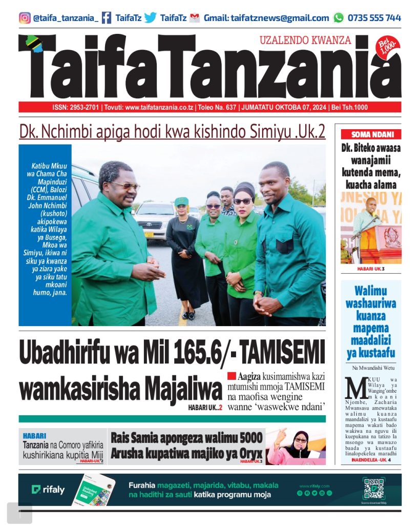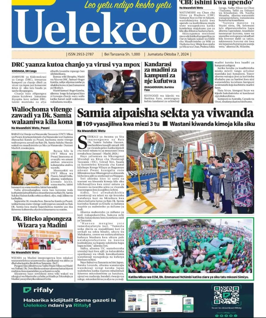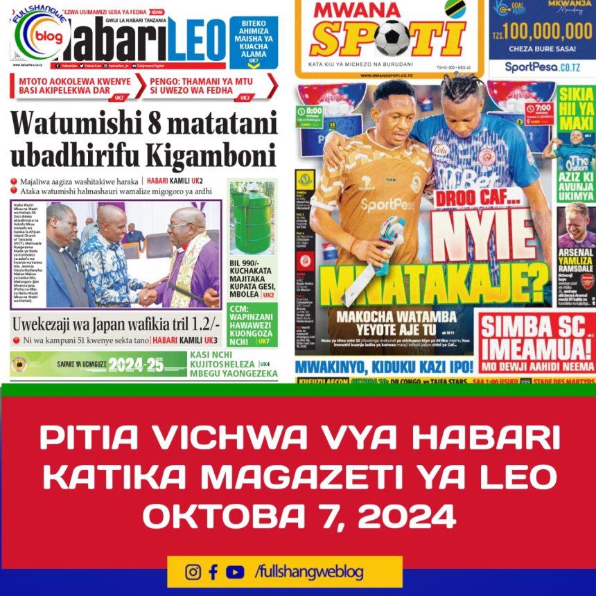 MagazetiPITIA VICHWA VYA HABARI KATIKA MAGAZETI YA LEO OKTOBA 7, 2024 Last updated: 2024/10/07 at 3:31 AM John Bukuku 1 year ago Share SHARE John Bukuku October 7, 2024 October 6, 2024 Share this Article Facebook Twitter Email Print Previous Article EPZA YATOA ELIMU KWA WADAUNA WANANCHI MAONESHO YA MADINI GEITA Next Article WAZIRI MKUU AKAGUA MRADI WA UCHAKATAJI MAJI TAKA, AZUNGUMZA NA WANANCHI KIGAMBONI