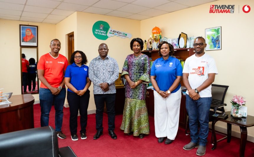 “Officials from Vodacom Tanzania Plc and Stanbic Bank Tanzania paid a courtesy visit to the Dodoma Regional Commissioner, Ms. Rosemary Senyamule (center), ahead of the Twende Butiama Cycling Tour’s arrival in Dodoma last Tuesday. As part of this initiative, Vodacom and Stanbic donated 100 desks and planted 1,000 trees at Dodoma Makulu Primary School. Additionally, 2,000 more trees will be planted in open areas of the city. Pictured from left to right: Joseph Sayi, Vodacom Tanzania’s Executive Head for the Central Region; Annette Nkini, Stanbic Bank’s Sustainability Manager; Dodoma Regional Administrative Secretary Kaspar Mmuya; Joan Mbise, Branch Manager in Dodoma; and Alex Bitekeye, Vodacom Tanzania’s PR Manager.”