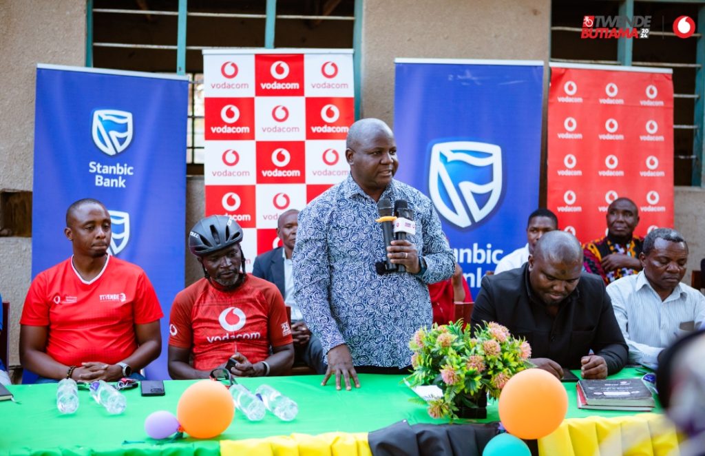 “Dodoma Regional Administrative Secretary Mr. Kaspar Mmuya delivers his remarks during the handover ceremony of 100 desks and 1,000 trees at Dodoma Makulu Primary School, donated by Vodacom Tanzania and Stanbic Bank as part of the Vodacom Twende Butiama Cycling Tour 2024. Seated to his left is Dodoma’s Deputy Mayor, Mr. Fadhili Chibago, and Makulu Primary School Headmaster, Mr. Amon Sebyiga. On the far right is Vodacom Tanzania’s Executive Head for the Central Region, Joseph Sayi, followed by Gabriel Landa, the Founder of the Twende Butiama Cycling Tour.”
