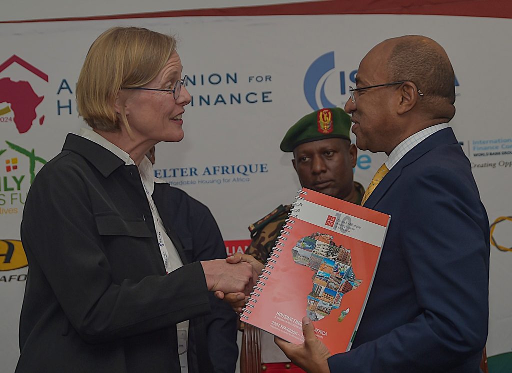 RAIS wa Zanzibar na Mwenyekiti wa Baraza la Mapinduzi Mhe.Dk.Hussein Ali Mwinyi akikabidhiwa Jarida la mwaka 2024 la “African Union Housing Finance” akikabidhiwa na Mwakilishi wa taaisi hiyo Kecia Rust, baada ya ufunguzi wa Mkutano wa Mwaka wa Pamoja kati ya Umoja wa Afrika na Jumuiya za Taasisi Zinazojishughulisha na Mikopo ya Nyumba, mkutano huo unaofanyika katika ukumbi wa Hoteli ya Melia Kiwengwa Mkoa wa Kaskazini Unguja leo 16-10-2024.(Picha na Ikulu).