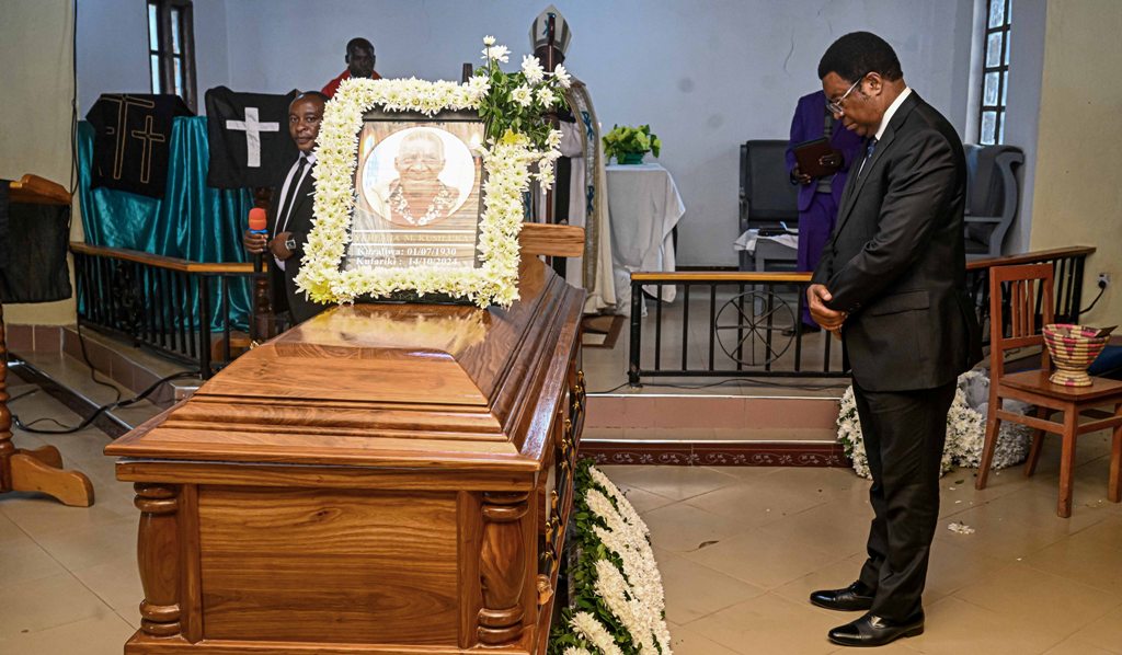 Waziri Mkuu Kassim Majaliwa akitoa heshima za mwisho kwa mwili wa Mzee Jeremiah Kusiluka ambaye ni Baba Mzazi mzazi wa Katibu Mkuu Kiongozi Balozi Moses Kusiluka alipomwakilisha Rais Dkt. Samia Suluhu Hassan katika mazishi ya Mzee Jeremiah yaliyofanyika katika kijiji cha Madihani, Makete mkoani Njombe, Oktoba 16, 2024. (Picha na Ofisi ya Waziri Mkuu)