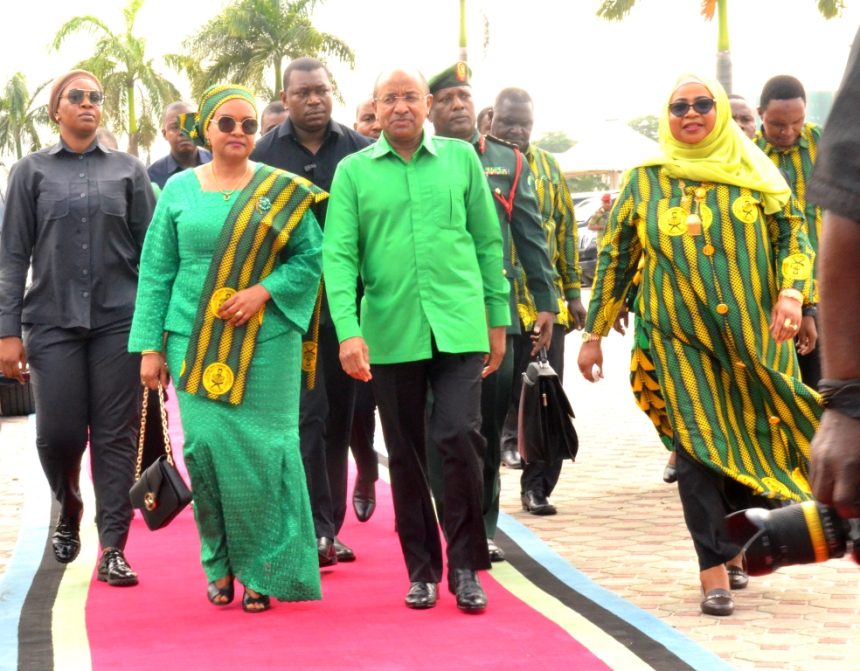 Makamu Mwenyekiti wa Chama cha Mapinduzi ambae pia ni Rais wa Zanzibar na Mwenyekiti wa Baraza la Mapinduzi Dk Hussein Ali Mwinyi akifuatana na Mke wake Mama Mariam Mwinyi wakiingia katika hafla ya Kongamano la Kumpongeza Rais Dk Mwinyi kwa Kutimiza Miaka Minne (4)ya Uongozi wake lililoandaliwa na Umoja wa Wazazi wa CCM Verde Hotel Marina Maruhubi Zanzibar.