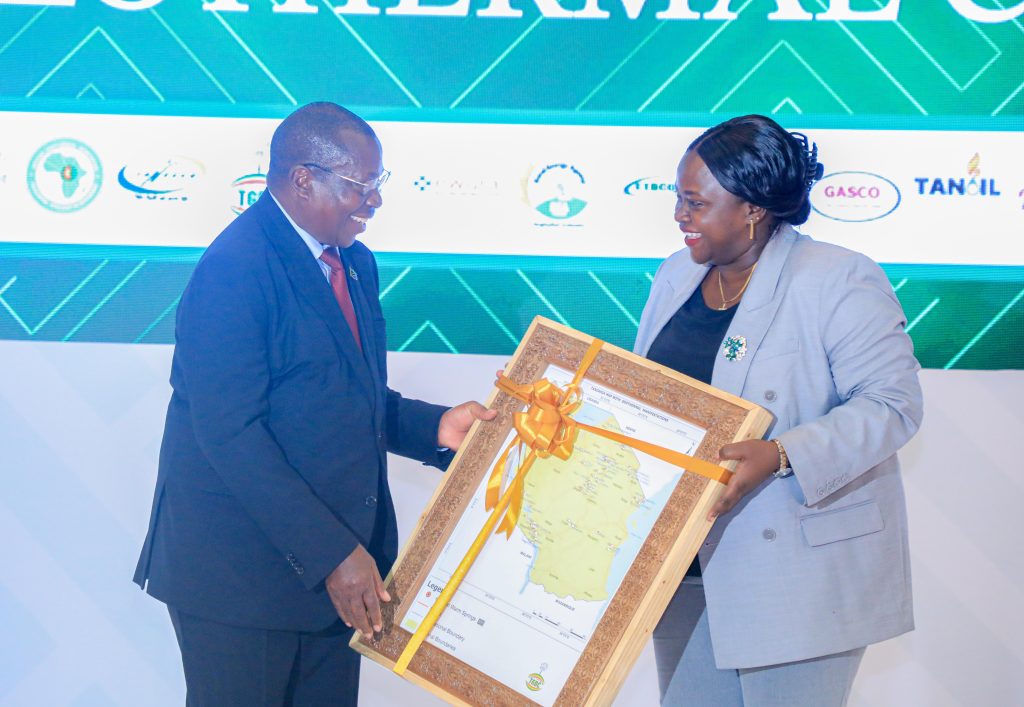 Makamu wa Rais wa Jamhuri ya Muungano wa Tanzania Mhe. Dkt. Philip Mpango akikabidhiwa zawadi ya picha ya ramani inayoonesha maeneo yenye rasilimali ya jotoardhi kutoka kwa Naibu Waziri wa Nishati Judith Kapinga wakati wa Kongamano la 10 la Jotoardhi Afrika linalofanyika katika Kituo cha Kimataifa cha Mikutano cha Julius Nyerere Jijini Dar es Salaam. Tarehe 23