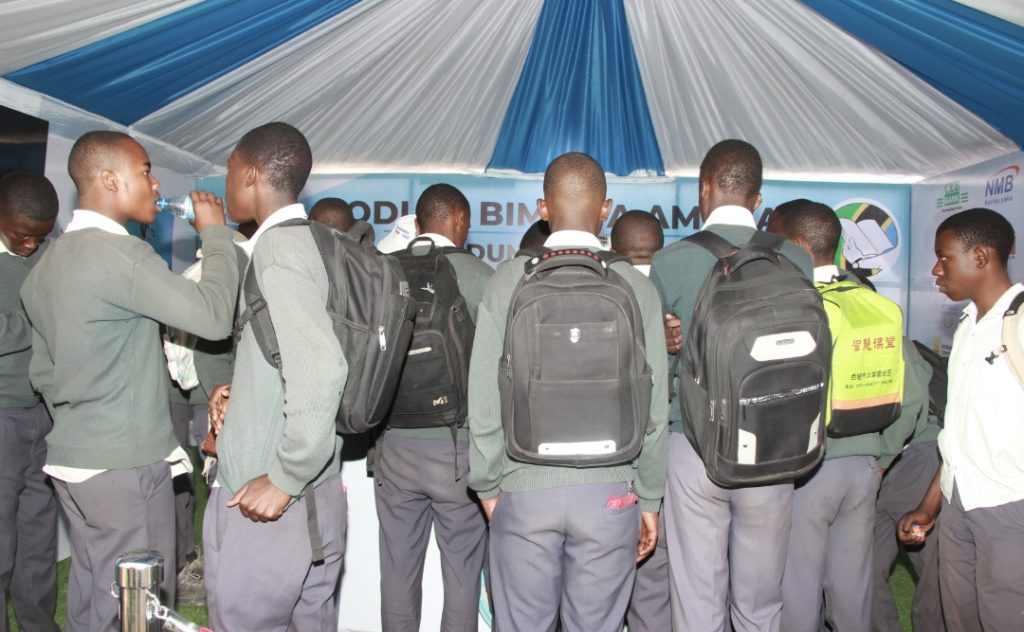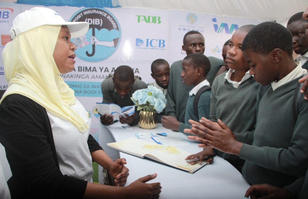 Baadhi ya wanafunzi waliotembelea banda la DIB wakipata maelezo kutoka kwa Thuwaiba Juma Afisa wa Bodi ya Bima ya Amana.