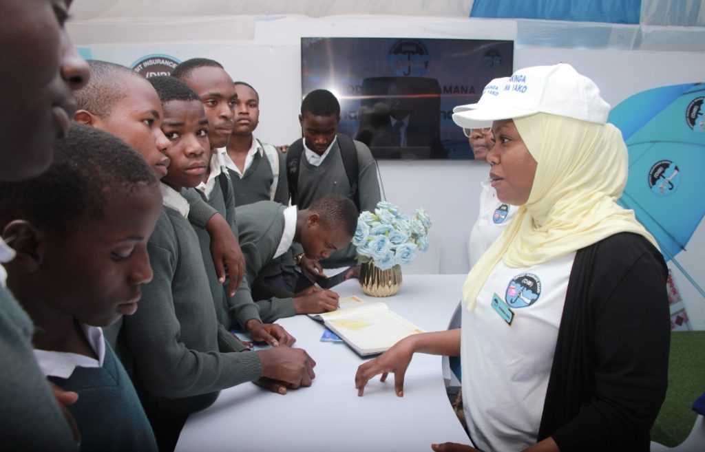 Baadhi ya wanafunzi waliotembelea banda la DIB wakipata maelezo kutoka kwa Thuwaiba Juma Afisa wa Bodi ya Bima ya Amana.