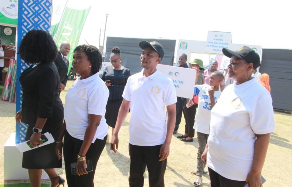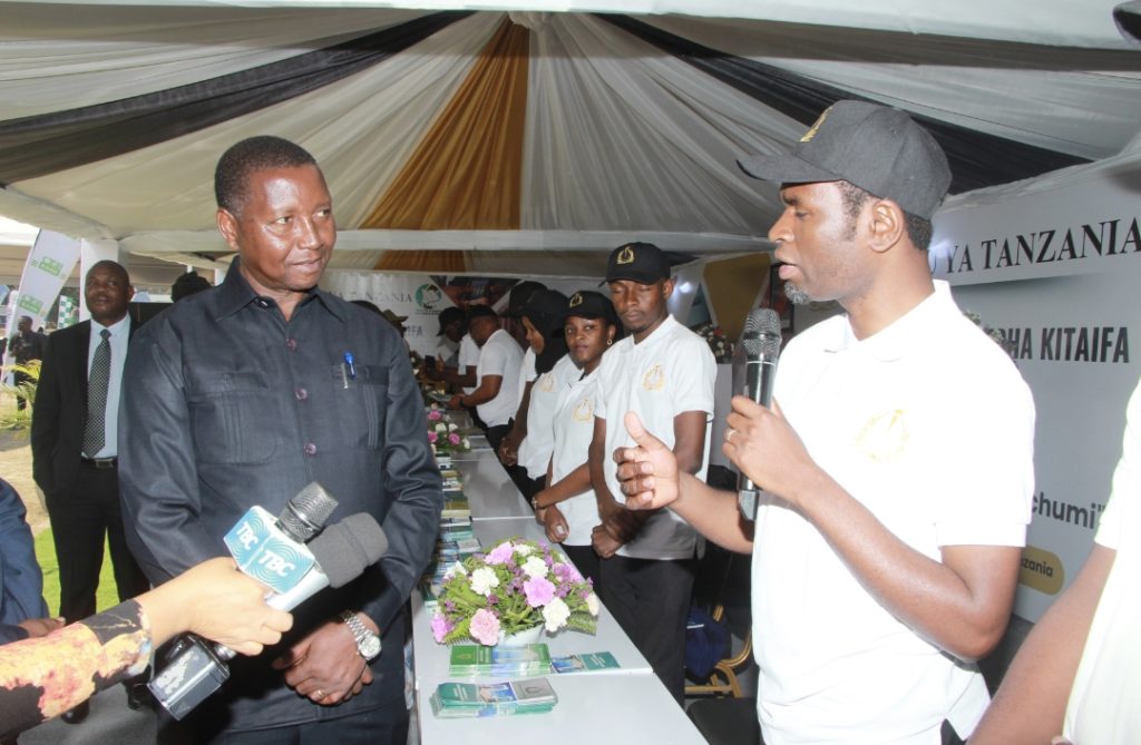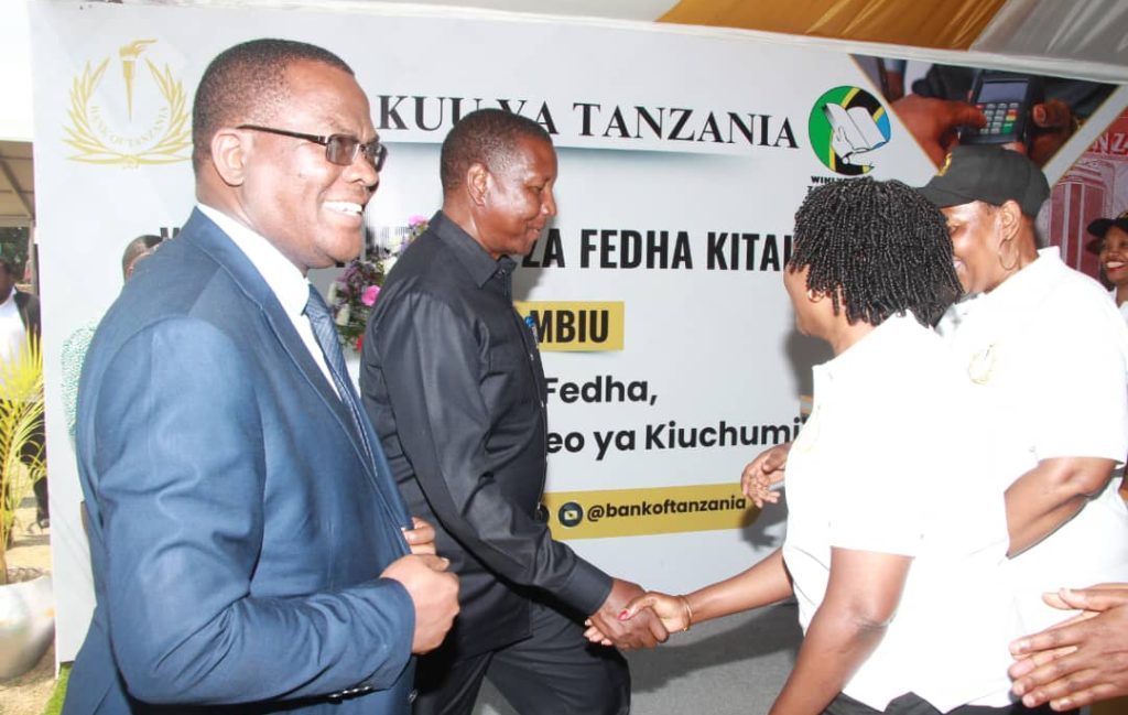 Waziri wa Elimu Sayansi na Teknolojia, Mhe. Prof. Adolf Mkenda, akisalimiana maofisa mbalimbali katika banda la BoT kushoto ni Kamishna wa Idara ya Uendelezaji wa Sekta ya Fedha, Dkt. Charles Mwamwaja