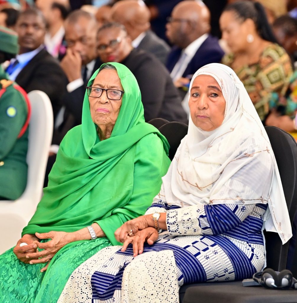 Mwenza wa Muasisi wa Mapinduzi Matukufu ya Zanzibar Hayati Abeid Amani Karume mama Fatma Karume kushoto na Siti Mwinyi Mwenza wa Rais Mstaafu wa Jamhuri ya Muungano wa Tanzania Hayati Ali Hassan Mwinyi wakiwa katika ufunguzi wa Mkutano wa 11 wa Merck Foundation Africa Asia Luminary uliofanyika katika hoteli ya Johari Rotana Jijini Dar es Salaam tarehe 29 Oktoba, 2024.